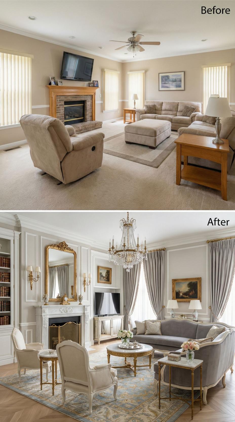 Crystal chandeliers and gilded mirrors transform this once-mundane builder grade family room into a lavish French salon worthy of Versailles. Ornate molding replaces plain walls while luxurious drapery in rich fabrics frames every window. The marble fireplace surround elevates the basic brick original, and antique furnishings create an opulent seating arrangement that screams sophistication and refinement.
