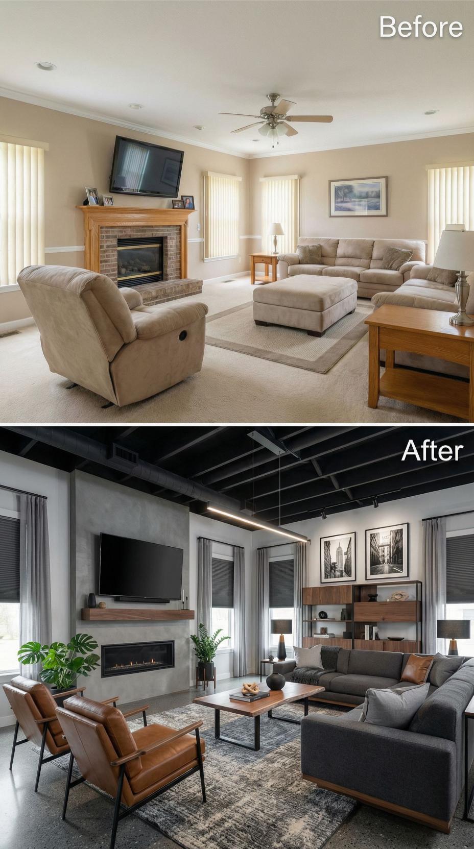 Bold black ceiling beams replace the mundane white ceiling, instantly transforming this builder grade family room into a dramatic showcase. Sleek charcoal sectional seating and cognac leather accent chairs create sophisticated conversation areas, while the floating walnut media console elevates the fireplace wall. Industrial lighting and curated black-and-white photography complete the moody, Instagram-worthy aesthetic that screams designer confidence.