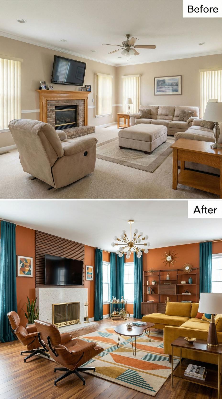 Dramatic burnt orange walls replace the builder grade family room’s safe beige palette, creating an unapologetically bold backdrop for mid-century modern furnishings. Rich teal curtains frame multiple windows while a geometric area rug anchors sleek walnut furniture and iconic leather lounge chairs. The original brick fireplace receives a stunning makeover with white marble and dark wood slat detailing, while a striking sputnik chandelier commands attention overhead.