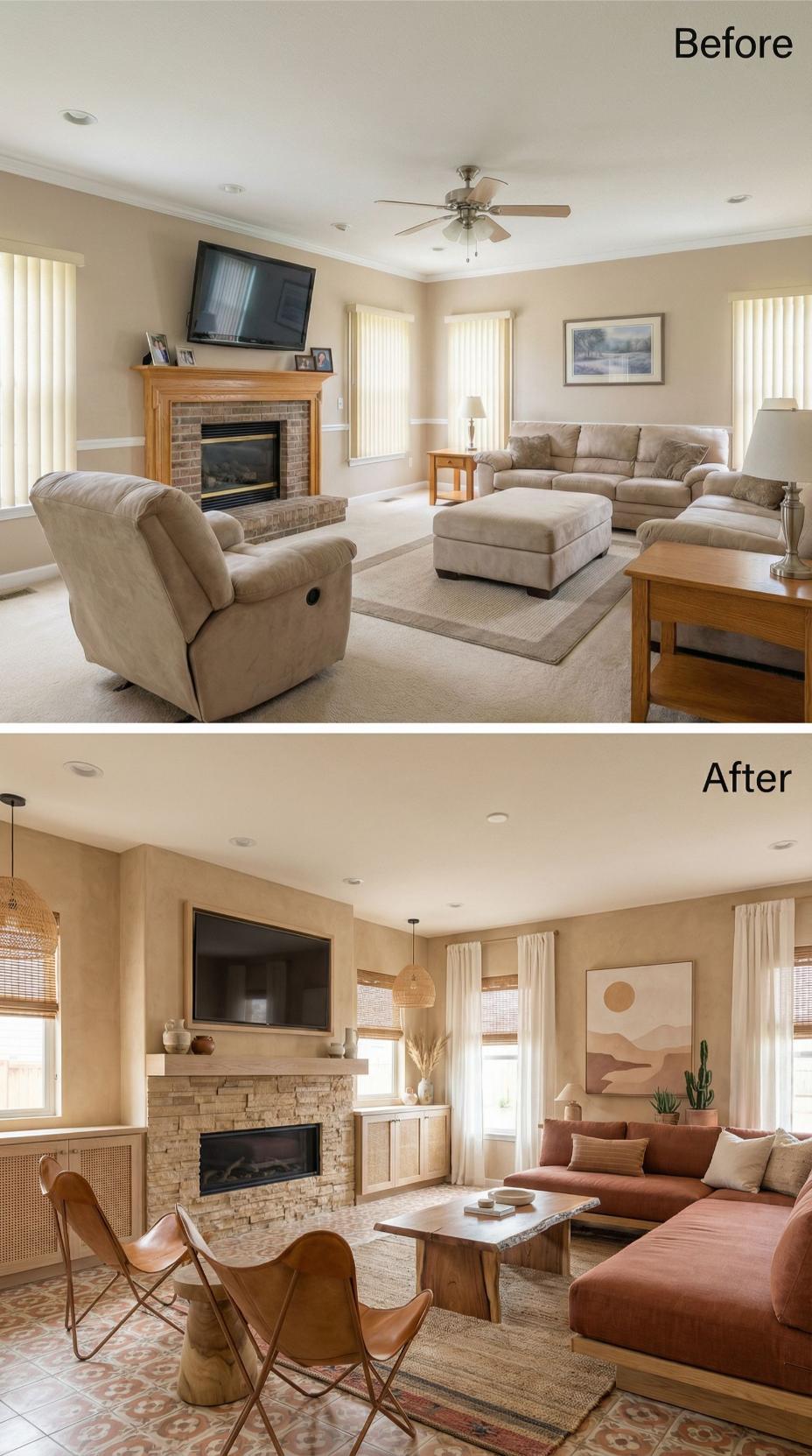 Warm terracotta tones and rich rust-colored sectional seating completely transformed this once-bland builder grade family room into a cozy, earthy retreat. Natural wood furniture, woven pendant lighting, and bamboo blinds replaced generic vertical blinds and neutral furnishings. Abstract desert-inspired artwork and strategically placed greenery add personality, while the updated fireplace styling creates a more intentional focal point that feels both sophisticated and inviting.
