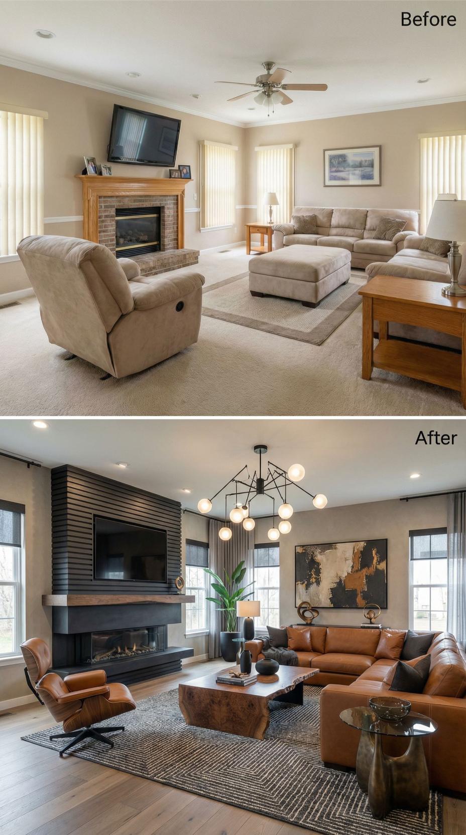 Warm cognac leather transforms this once-bland builder grade family room into a sophisticated showcase worthy of any design magazine cover. The dramatic black fireplace surround replaces generic brick, while statement lighting and rich textures elevate every surface. Strategic furniture placement creates intimate conversation zones, proving that bold material choices can completely reimagine a space’s personality and visual impact.