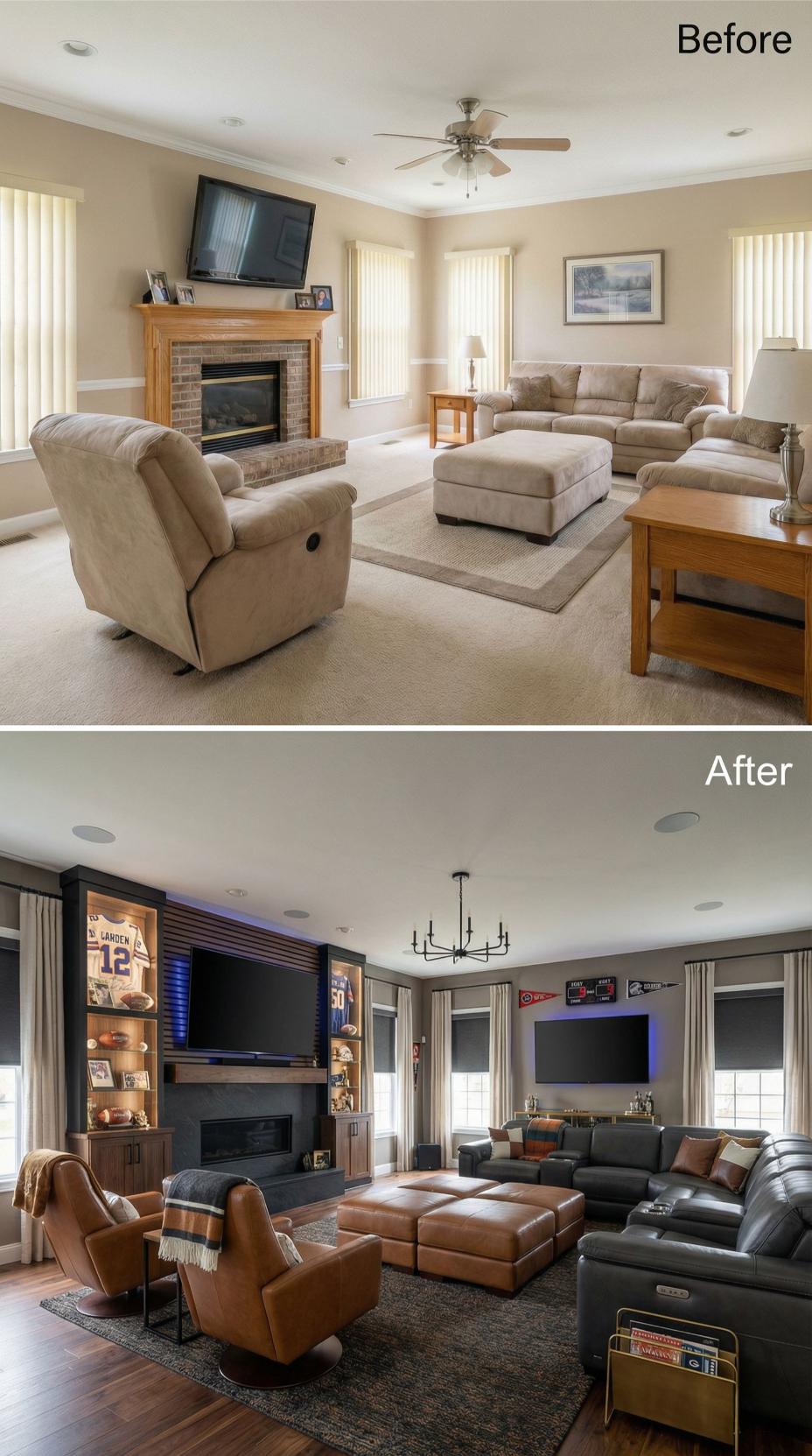 Dark leather sectionals and cognac accent chairs replace generic beige furniture, creating a masculine retreat perfect for game day gatherings. Custom built-ins showcase sports memorabilia while providing media storage, transforming the basic brick fireplace into a striking focal point. Rich hardwood floors, dramatic lighting, and layered window treatments elevate this builder grade family room into a personalized entertainment haven that commands attention.