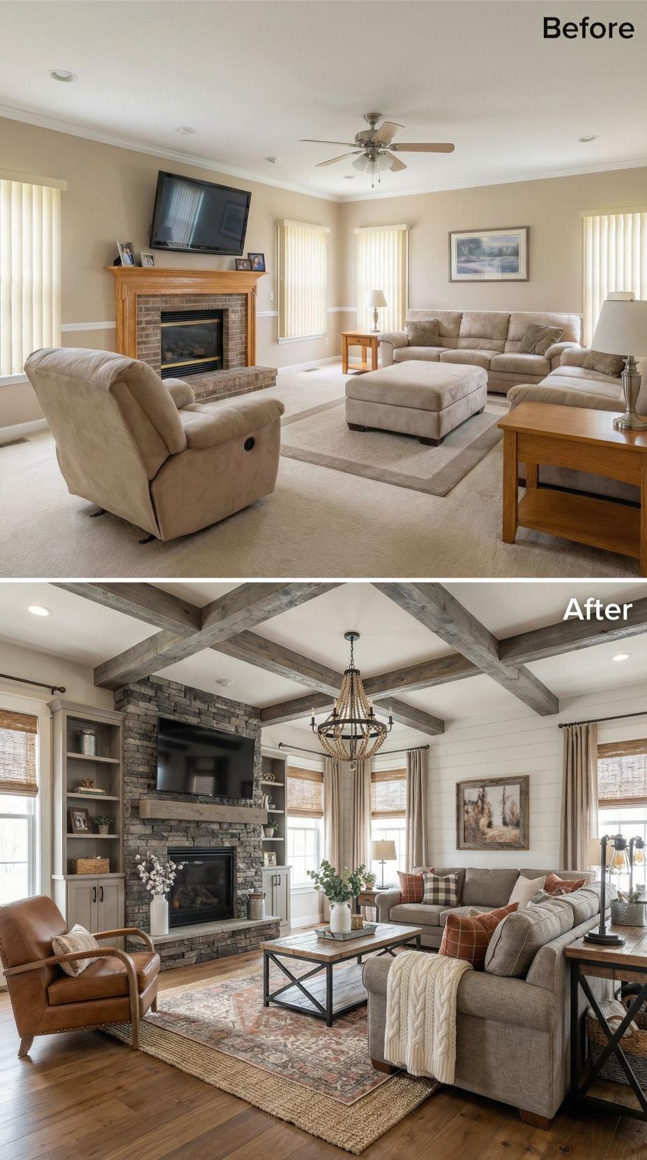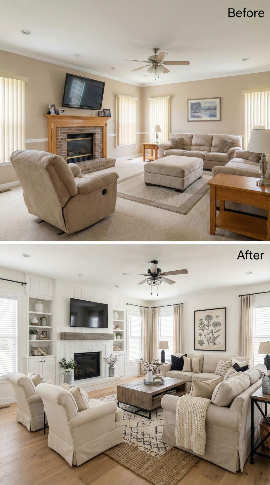 Exposed wood beams and shiplap paneling transform this once-bland builder grade family room into a stunning farmhouse showcase. Built-in shelving replaces bulky furniture while a geometric pendant light elevates the standard ceiling fan. White paint brightens the brick fireplace, and carefully curated decor creates the perfect backdrop for endless social media posts celebrating impeccable taste.