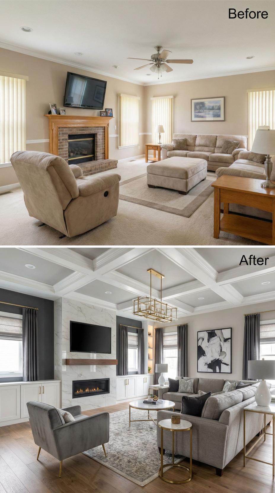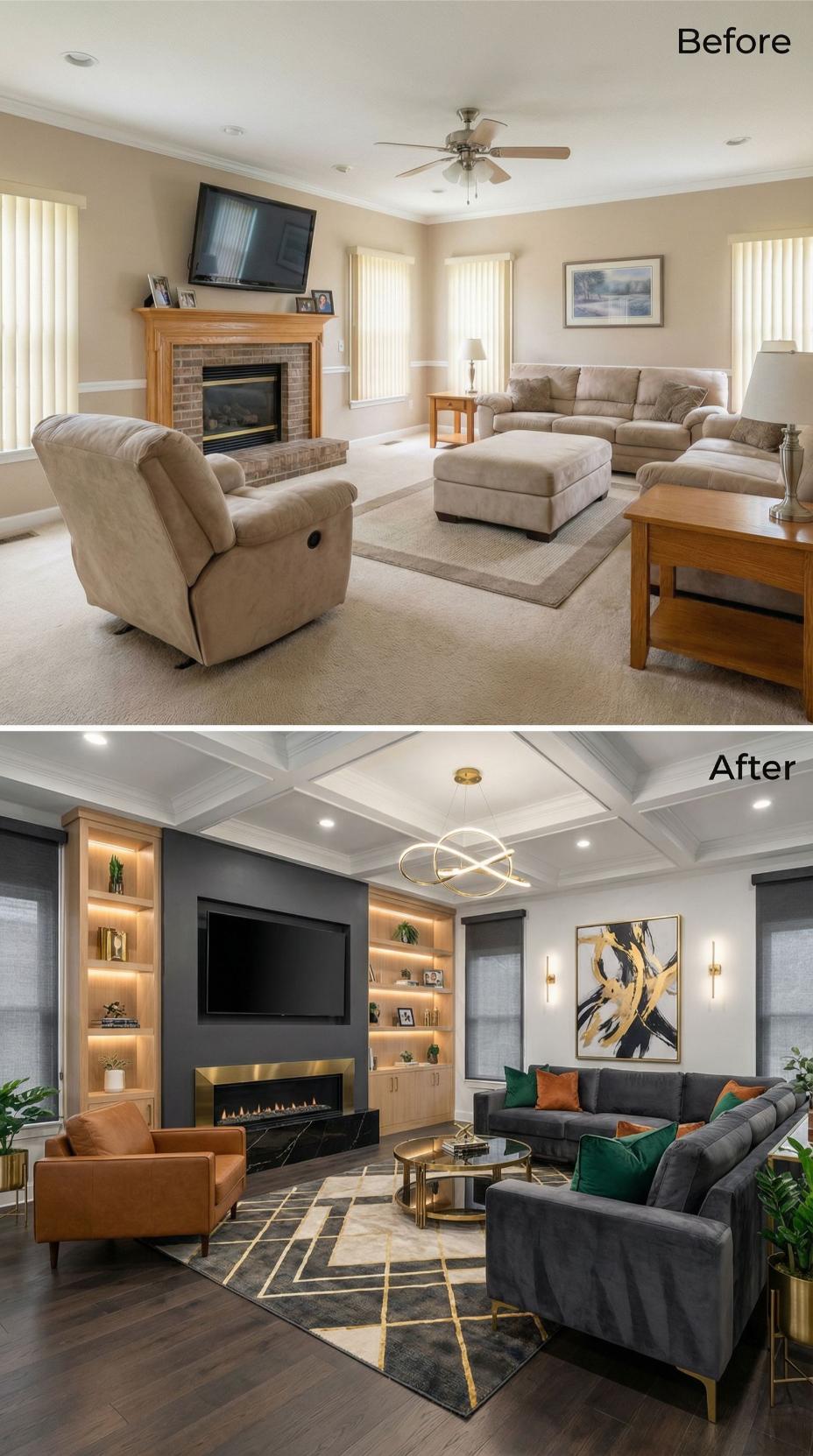 Dramatic coffered ceilings replace the plain flat ceiling while custom built-ins with marble surround transform the basic brick fireplace into a stunning focal point. Rich hardwood floors upgrade from builder-grade carpet, and the sophisticated charcoal and brass color palette creates an elevated aesthetic perfect for hosting stylish gatherings that demand social media documentation.