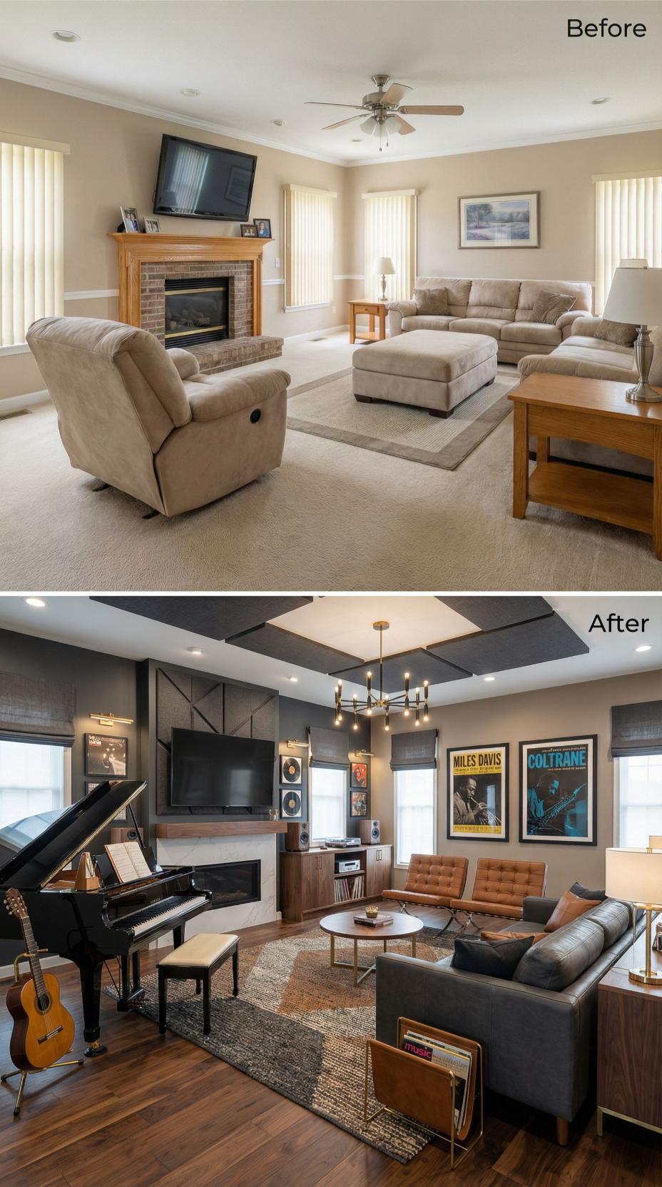 Dark charcoal accent walls and a striking geometric ceiling treatment transform this generic builder grade family room into a sophisticated music studio. Rich walnut built-ins house vinyl records and media equipment, while bronze fixtures and cognac leather seating create warm contrast against the moody palette. A grand piano anchors the space, with vintage jazz posters adding personality and visual interest to the dramatic makeover.