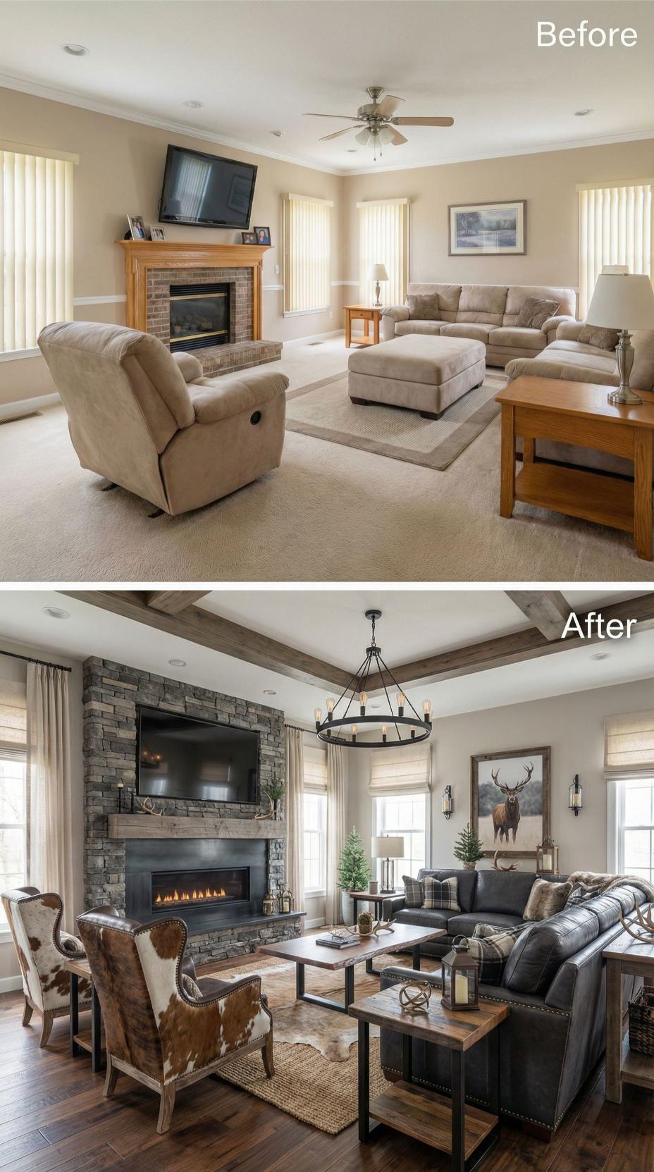 Dramatic stone cladding transforms this builder grade family room into a sophisticated retreat worthy of admiration. Rich charcoal leather seating replaces bland beige furniture, while cowhide accent chairs add luxurious texture. The expanded stone fireplace creates a commanding focal point, complemented by a striking wrought iron chandelier that replaces the basic ceiling fan. Warm hardwood floors and carefully curated artwork complete this show-stopping transformation.