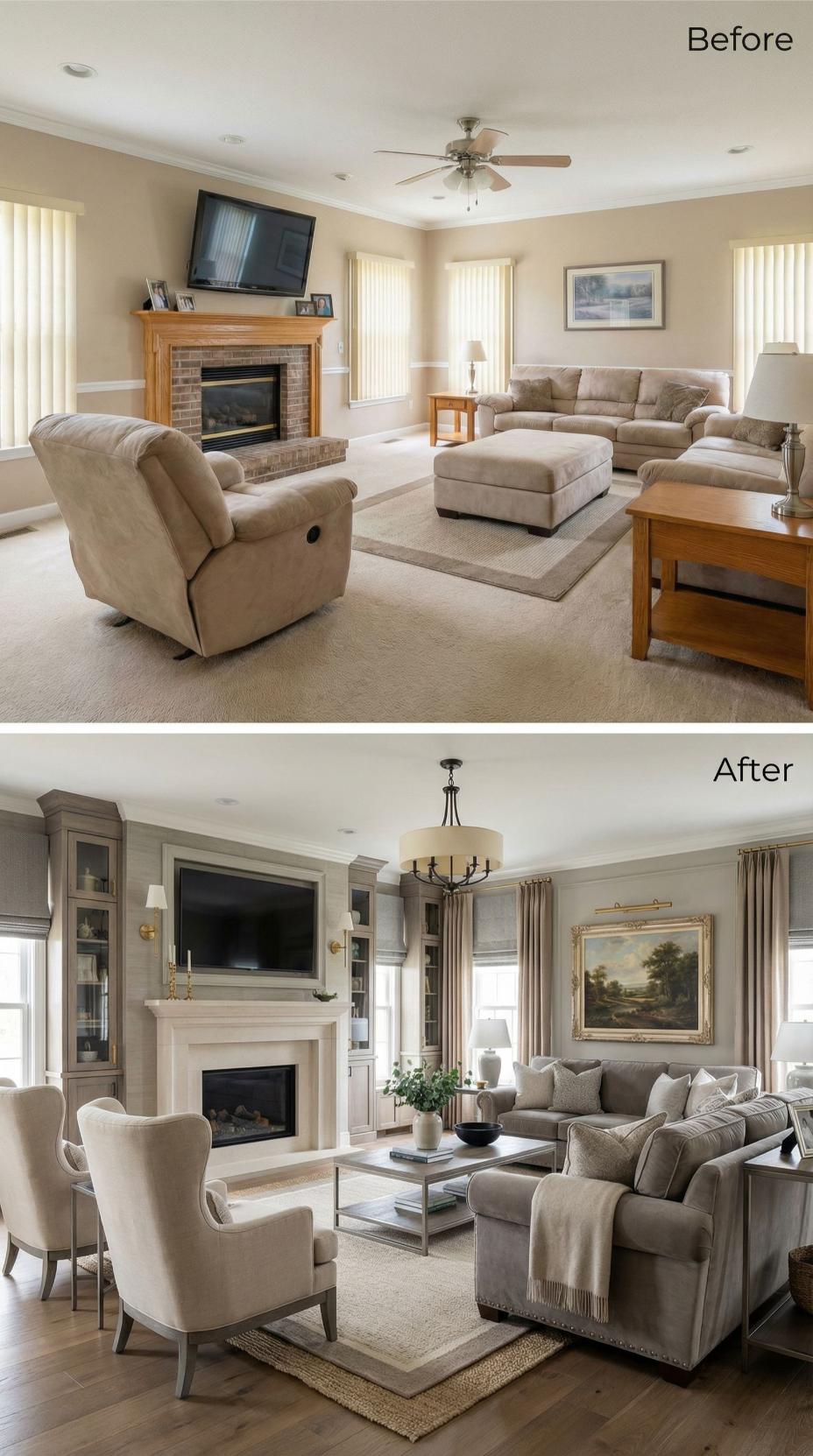 Custom built-ins transform this builder grade family room into a narcissist’s dream showcase. Gray-painted cabinetry flanks the fireplace, creating dramatic storage and display opportunities while elevating the TV to art-like status. Layered window treatments replace basic blinds, wingback chairs add sculptural presence, and the neutral palette shifts from beige boredom to sophisticated gray tones that photograph beautifully for social media.