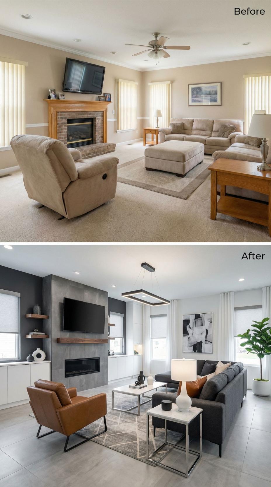 Warm cognac leather chairs and a charcoal sectional replace the dated beige furniture ensemble that dominated this builder grade family room. The original brick fireplace gets a sleek concrete makeover with floating walnut shelves, while modern pendant lighting and geometric coffee tables create sophisticated layers. White curtains and contemporary artwork complete the dramatic transformation from suburban standard to design-forward showpiece.