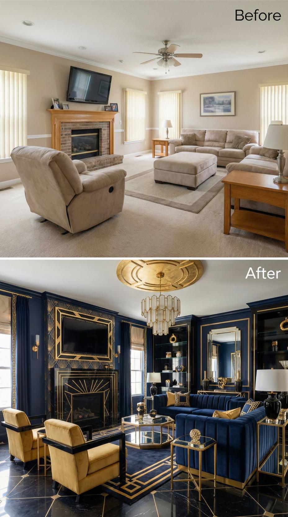 Bold navy walls with gold geometric trim transform this once-neutral builder grade family room into a luxurious Art Deco masterpiece. Velvet navy sectional seating replaces beige upholstery, while brass-framed furniture and a stunning crystal chandelier elevate the space. The original brick fireplace receives a dramatic makeover with gold sunburst detailing, creating an opulent focal point worthy of a design magazine cover.