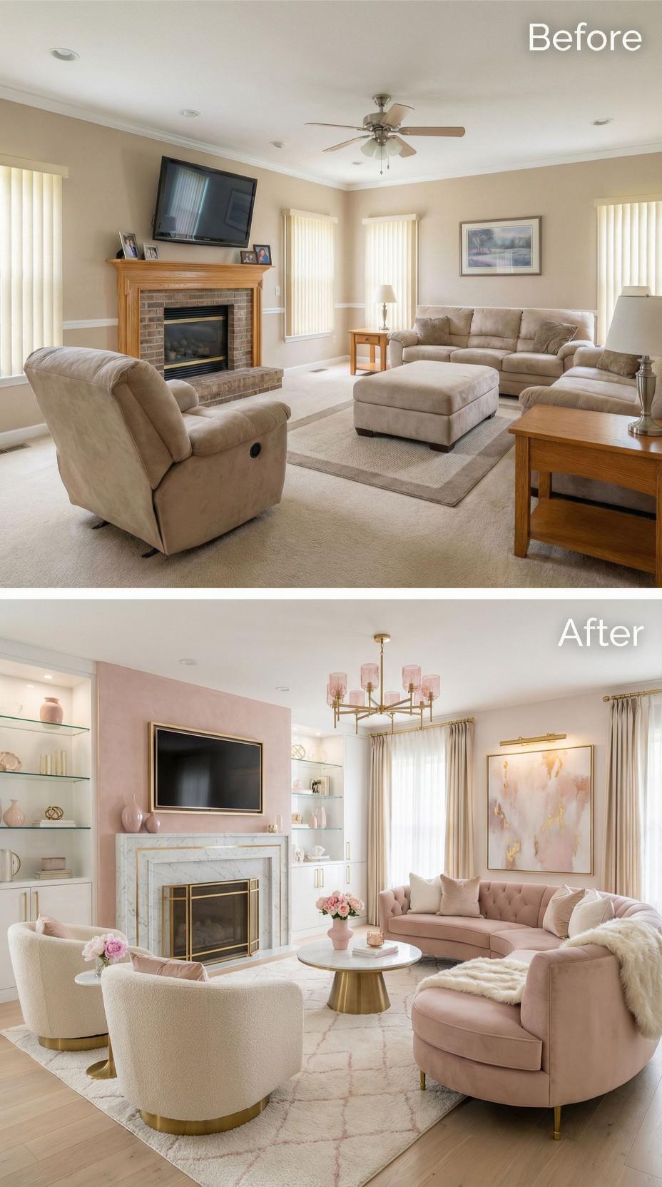 Soft blush pink walls and built-in shelving transform this once-beige builder grade family room into an Instagram-worthy haven. The original tan sectional gives way to a curved pink velvet sofa and cream swivel chairs with gold bases. A marble-surround fireplace replaces the brick version, while a crystal chandelier and round marble coffee table complete the luxurious makeover.