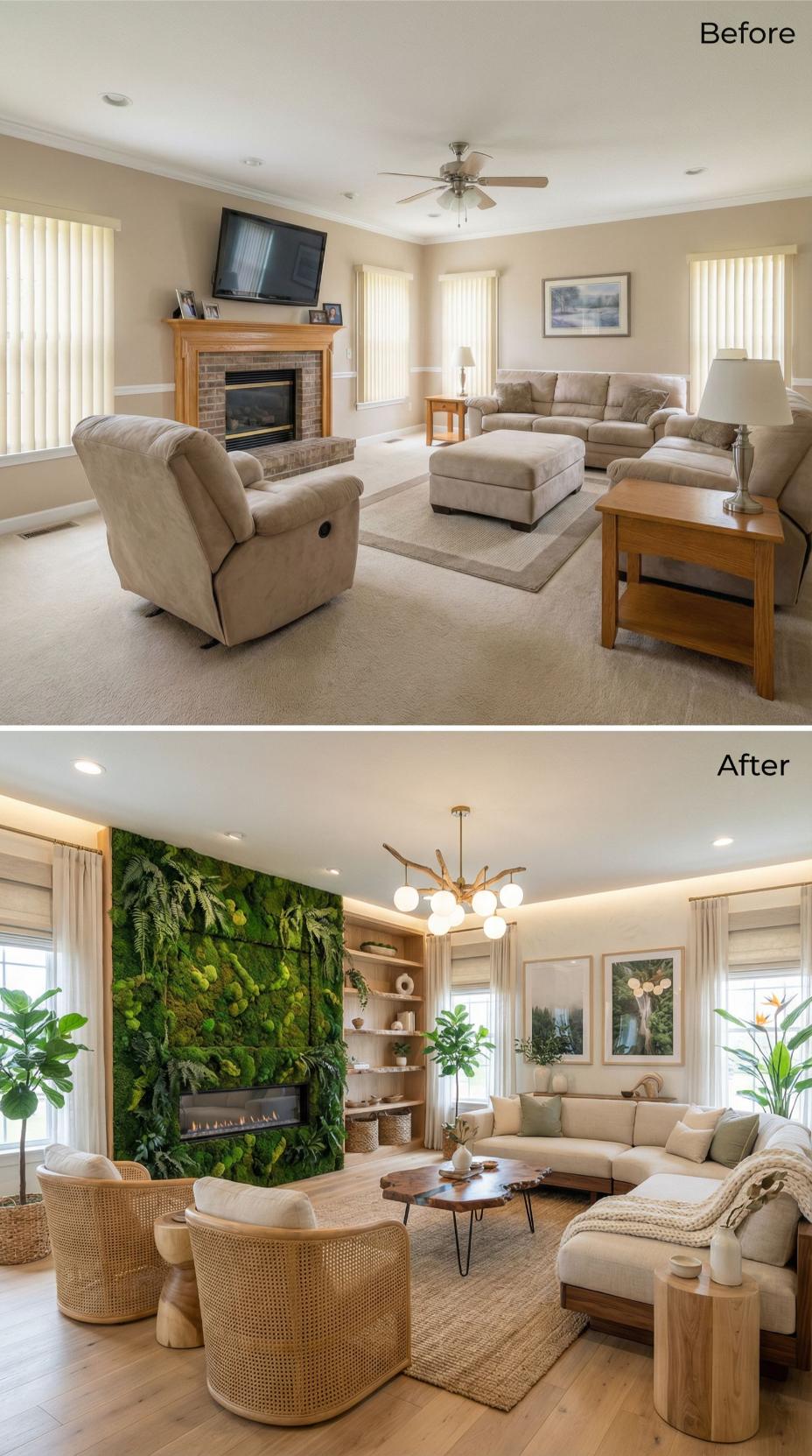 Natural textures and living greenery transform this once-bland builder grade family room into a sophisticated biophilic retreat. The stunning moss wall replaces the traditional brick fireplace surround, while woven cane chairs and organic wood furnishings create warmth against neutral tones. Built-in shelving maximizes storage and display opportunities, complemented by modern lighting that illuminates the space’s newfound botanical personality with dramatic flair.