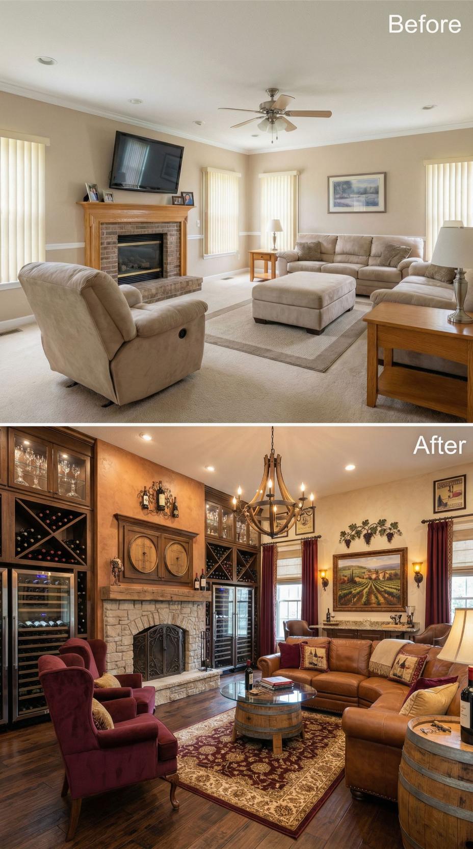 Rich burgundy leather seating and deep wine-colored accent chairs replace bland beige furniture, creating an opulent entertainment space. Custom built-in wine storage with glass-front cabinets transforms the fireplace wall into a collector’s showcase, while warm wood tones and a traditional Persian rug add luxurious texture. The barrel coffee table and ornate chandelier complete this dramatic metamorphosis from builder grade family room to sophisticated wine lover’s retreat.