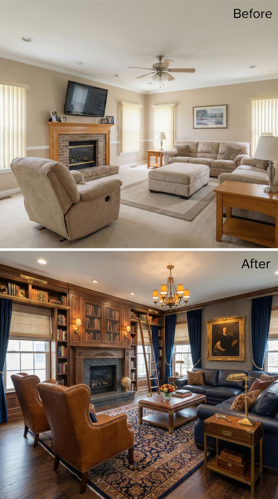 Rich walnut built-ins transform this ordinary builder grade family room into a sophisticated gentleman’s library worthy of any grand estate. Floor-to-ceiling bookcases with rolling ladder create dramatic vertical interest, while navy velvet seating and ornate Persian rugs replace the previous beige monotony. Elegant brass sconces and a statement chandelier elevate the lighting scheme, complementing the classical portrait and luxurious window treatments.