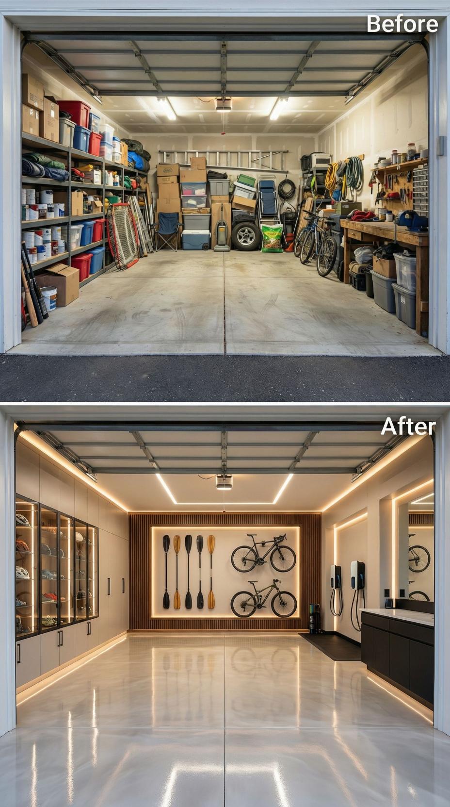 A complete transformation elevates this builder grade garage space into a sleek, organized haven. Custom walnut wood storage systems replace scattered shelving, while polished concrete floors with crisp white lines create defined zones. Professional bike mounting systems and integrated LED accent lighting showcase the dramatic upgrade from basic storage to sophisticated workspace design.