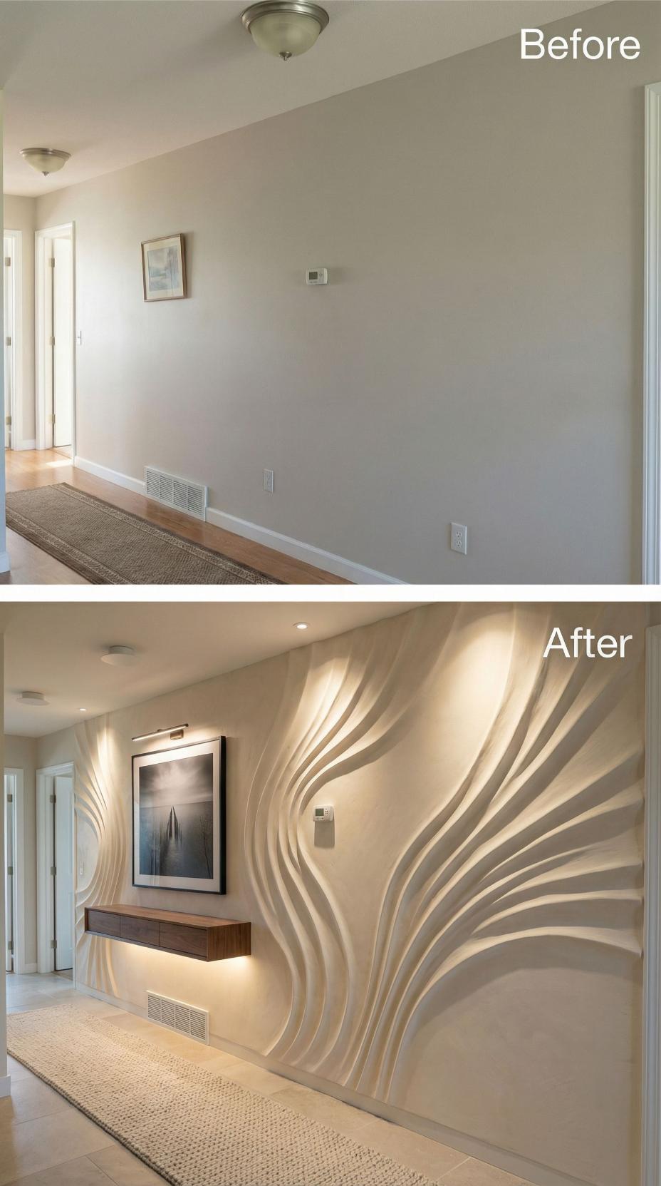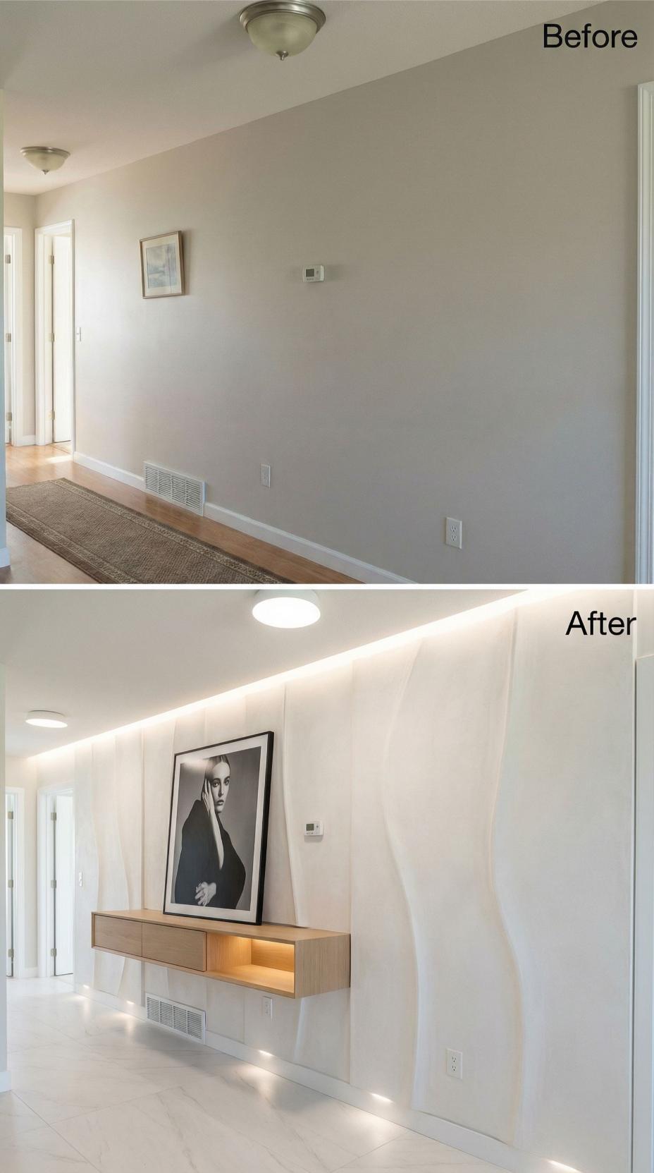 Dramatic three-dimensional wall panels create flowing curves that completely reimagine this once-bland builder grade hallway. The sculptural installation features warm lighting that highlights each ridge and valley, while a floating walnut console adds sophisticated storage. Modern recessed ceiling fixtures and strategic accent lighting elevate the space from basic to breathtaking, proving how architectural details can transform any corridor into a design statement.