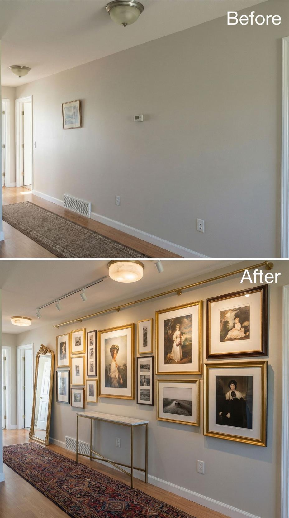 Dramatic track lighting transforms this builder grade hallway into an elegant gallery space showcasing classical portraits in matching gold frames. The sophisticated salon-style arrangement creates visual interest along the previously barren wall, while a sleek console table adds functional surface area. Warm LED spotlights illuminate each artwork, elevating the mundane corridor into a museum-worthy display that celebrates art and architectural detail.