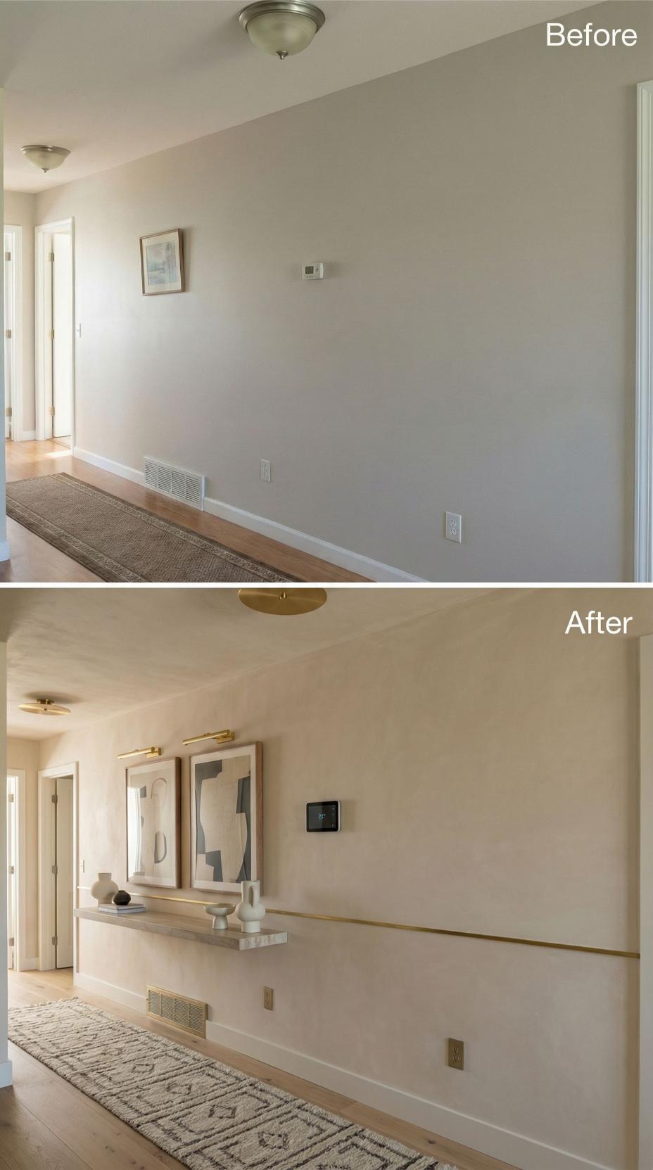 Gleaming brass fixtures and a sophisticated floating shelf completely transformed this builder grade hallway into an elegant gallery space. Modern recessed ceiling lights with metallic accents replaced basic flush mounts, while a continuous brass ledge provides perfect display space for curated artwork. The warm metallic elements create visual interest and elevate the neutral palette with luxurious finishing touches.
