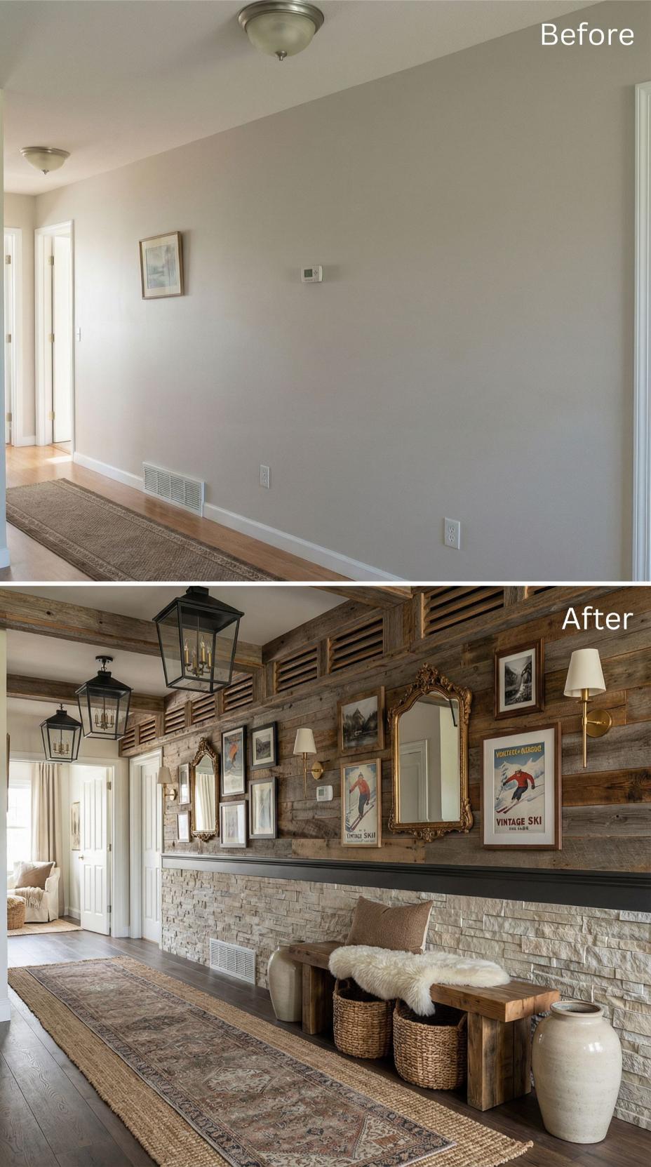 Reclaimed wood planking transforms this builder grade hallway into a stunning focal point, creating visual interest where once existed only plain drywall. Stone wainscoting adds texture and warmth, while black lantern-style pendant lights replace basic flush-mount fixtures. A carefully curated gallery wall showcases vintage ski posters and artwork, supported by built-in shelving that incorporates woven baskets for stylish storage solutions.