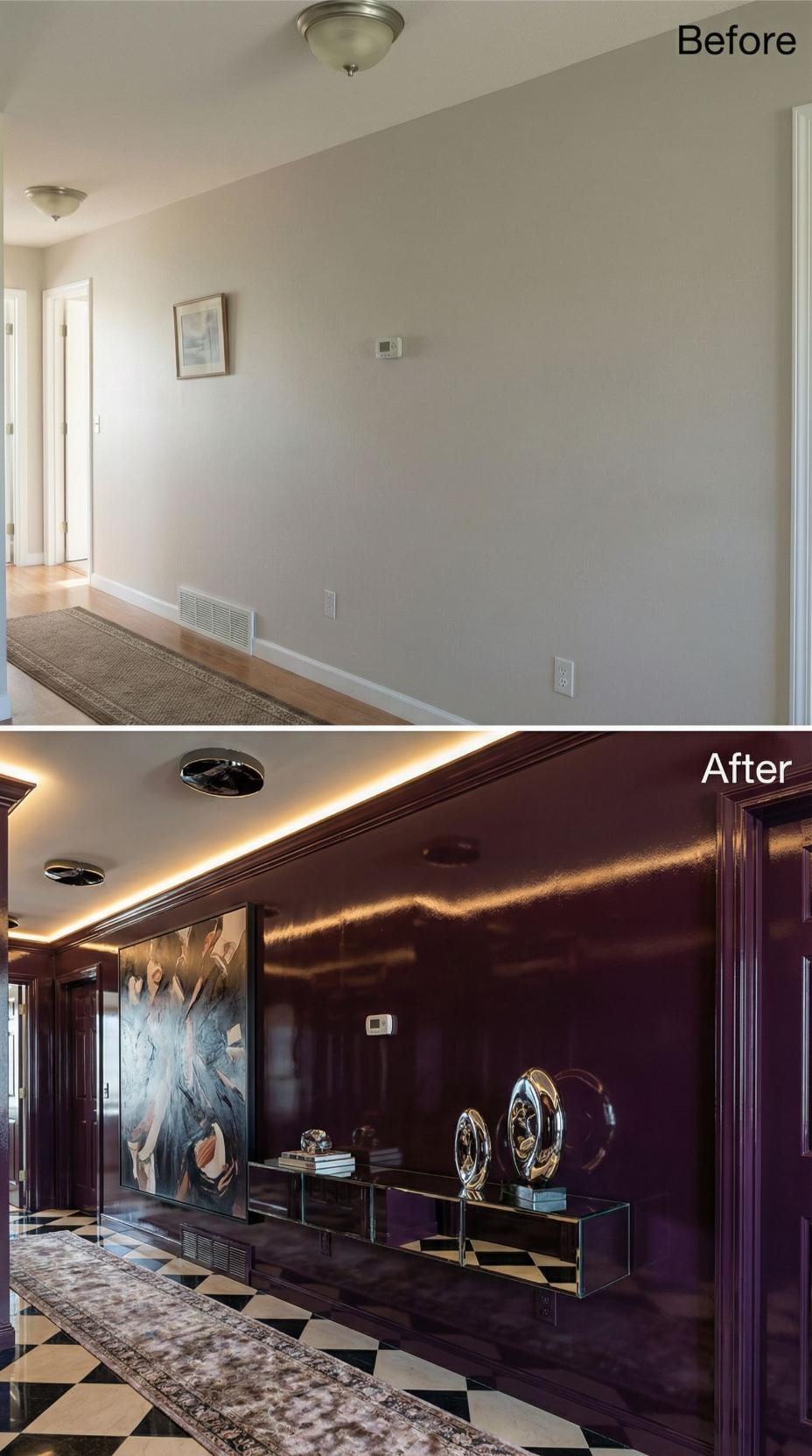 Rich burgundy walls and glossy black-and-white checkered flooring transform this once-bland builder grade hallway into a sophisticated gallery space. Crown molding and recessed lighting with warm LED strips create architectural interest, while a sleek glass console displays curated decorative objects. The dramatic color palette elevates the narrow corridor into an impressive transitional zone.