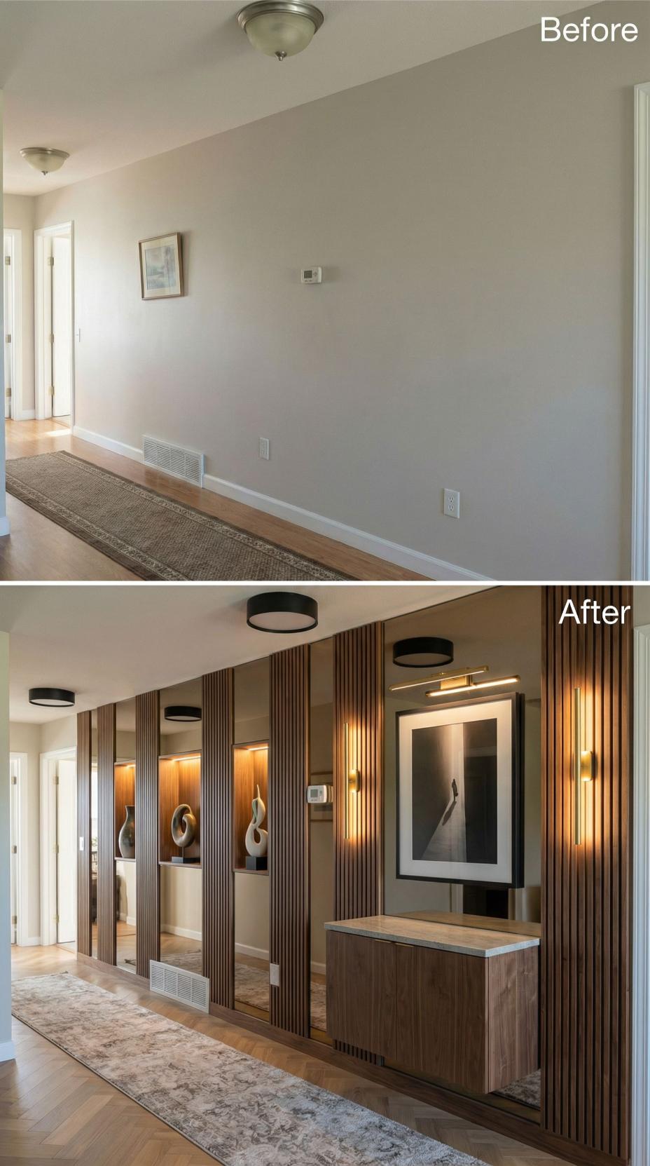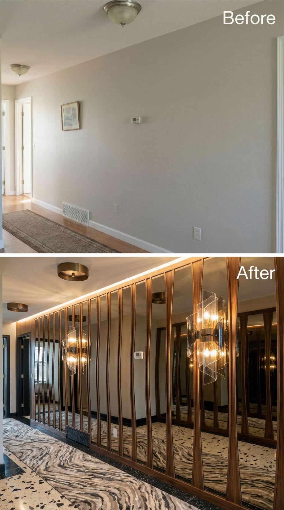 Dramatic floor-to-ceiling mirrors with warm brass framing completely transformed this once-bland builder grade hallway into a sophisticated passage. Strategic LED strip lighting illuminates the vertical slats while stunning geometric pendant lights create focal points throughout the space. Rich patterned carpeting and coordinated ceiling fixtures elevate the entire corridor into a hotel-worthy experience that maximizes light and visual depth.
