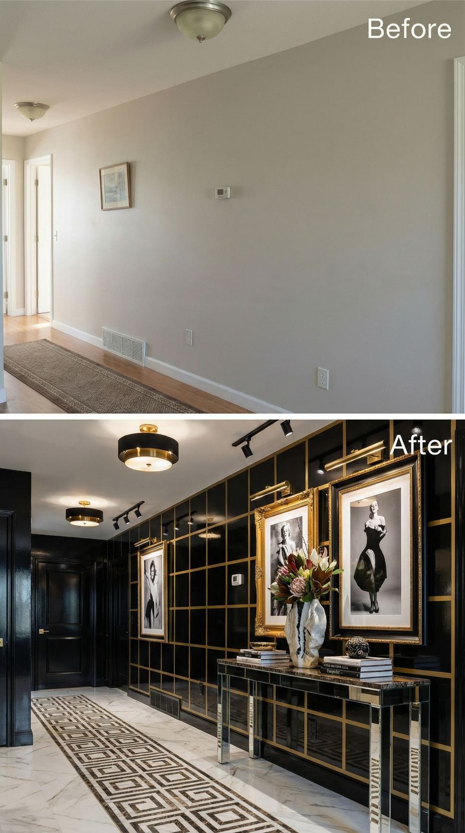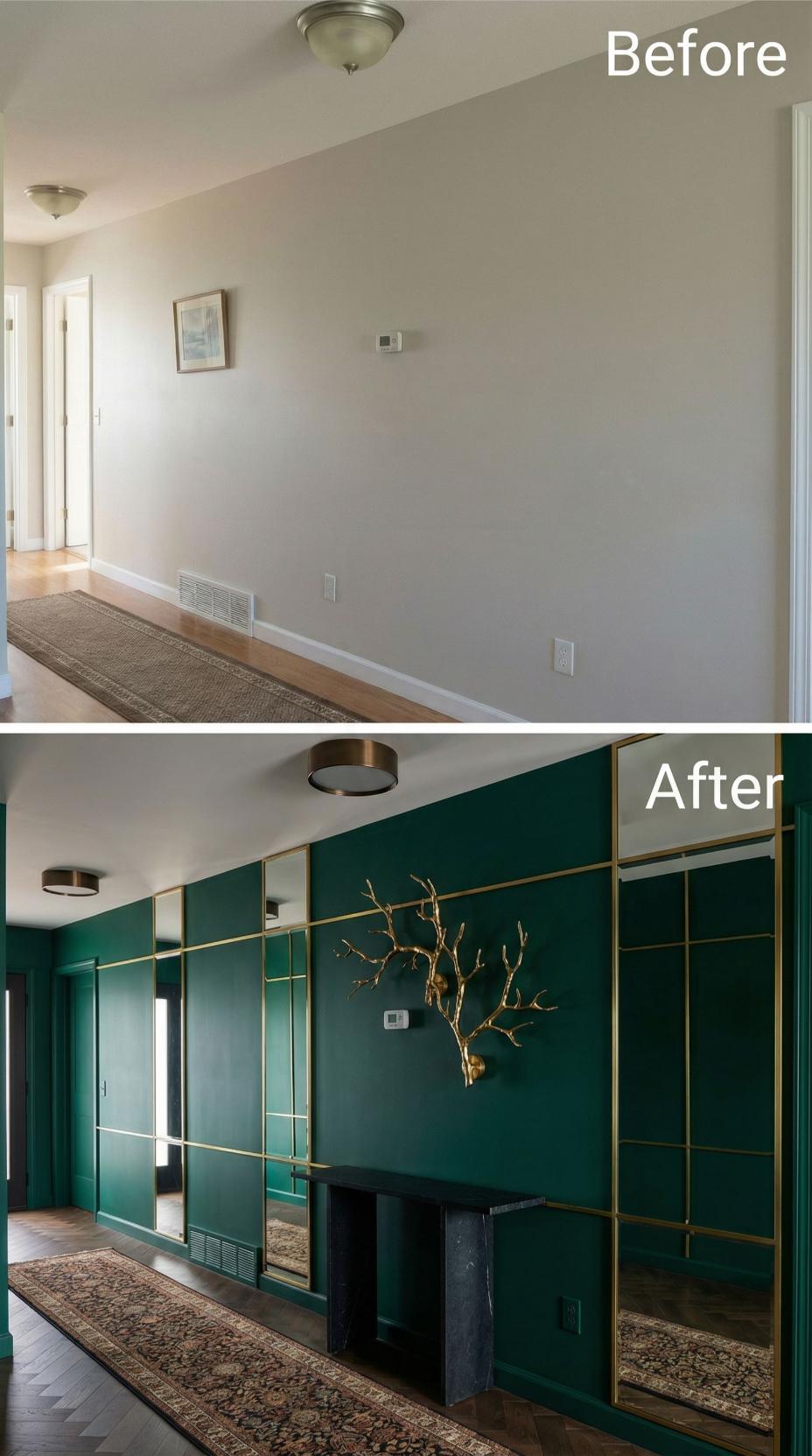 Dark emerald walls adorned with geometric gold molding create dramatic contrast against the original builder grade hallway’s bland beige surfaces. Black and brass ceiling fixtures replace standard flush mounts, while classical photography in ornate frames transforms blank walls into a curated gallery experience. A sleek mirrored console and geometric runner complete this sophisticated metamorphosis from generic corridor to luxurious passage.