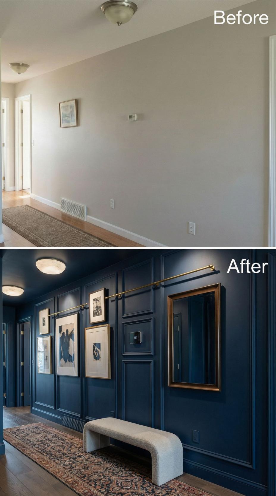 Deep navy wainscoting transforms this builder grade hallway into a sophisticated gallery space with custom millwork and brass picture ledges. Flush-mount ceiling lights replace dated fixtures while carefully curated artwork creates visual interest against the rich blue backdrop. The neutral upholstered bench provides both seating and storage, completing this dramatic makeover that elevates the entire home’s aesthetic.