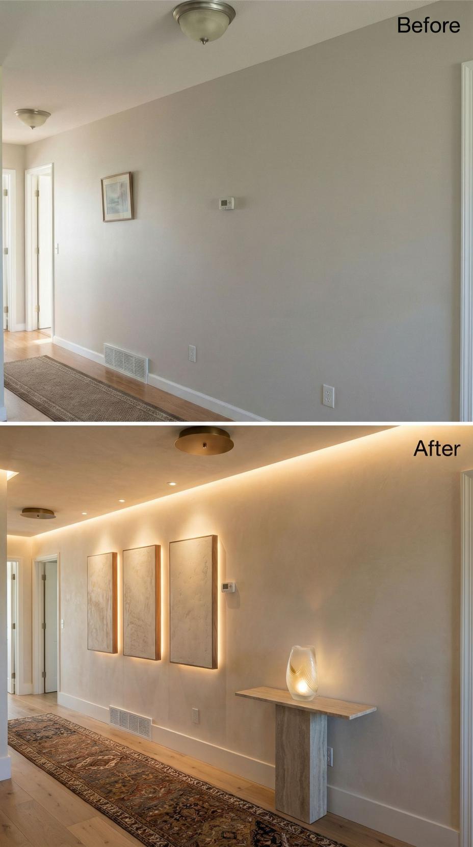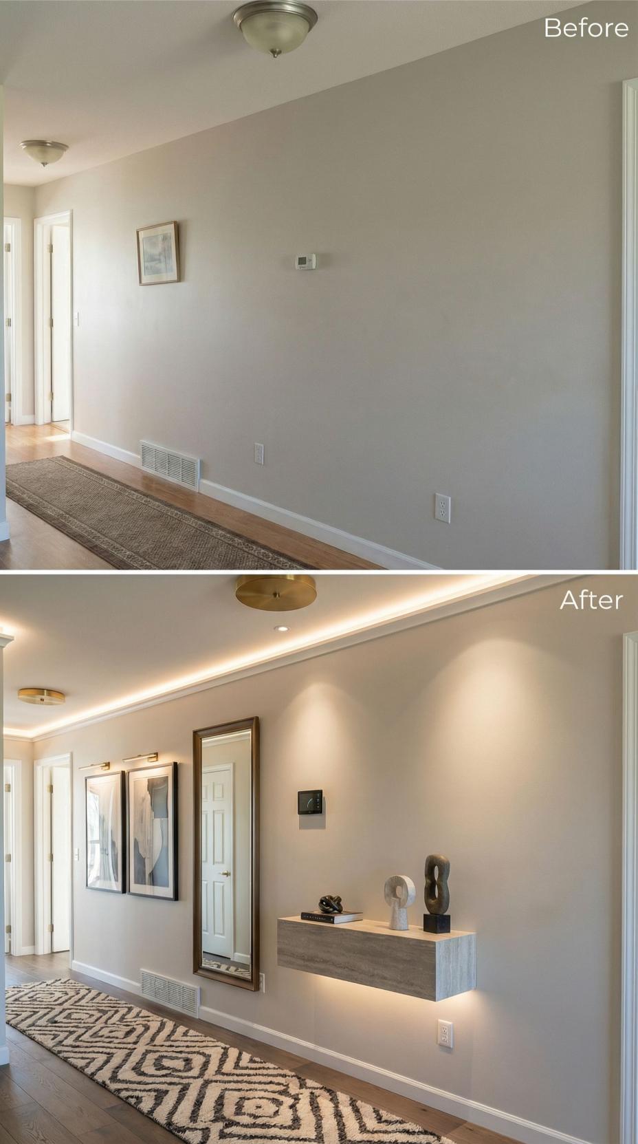 LED strip lighting transforms this previously bland corridor into an architectural masterpiece with dramatic ceiling coves that cast warm ambient light. A floating walnut console shelf replaces empty walls, creating display space for curated sculptural objects. Large-scale framed artwork and a full-length mirror elevate the space from basic passageway to sophisticated gallery entry that welcomes guests with designer-level impact.