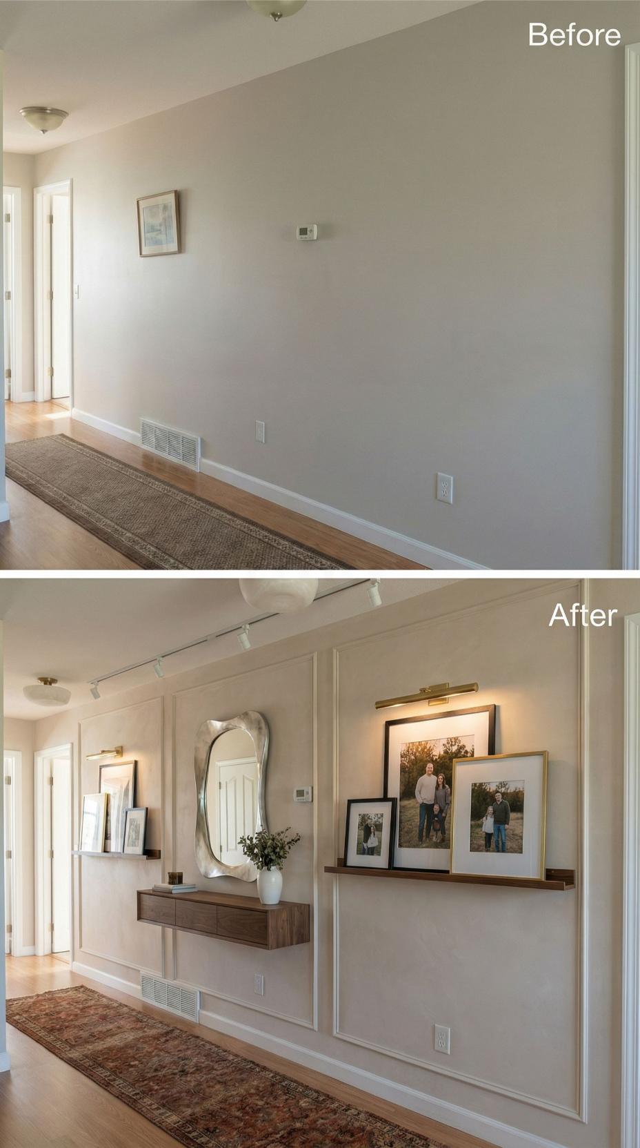 Wall-mounted floating shelves and track lighting completely transformed this builder grade hallway into a sophisticated gallery space. Rich walnut shelving provides elegant display areas for family photos and decorative objects, while the illuminated mirror creates a functional focal point. Strategic lighting and layered artwork turn the once-bland corridor into a welcoming entry that showcases personal style.