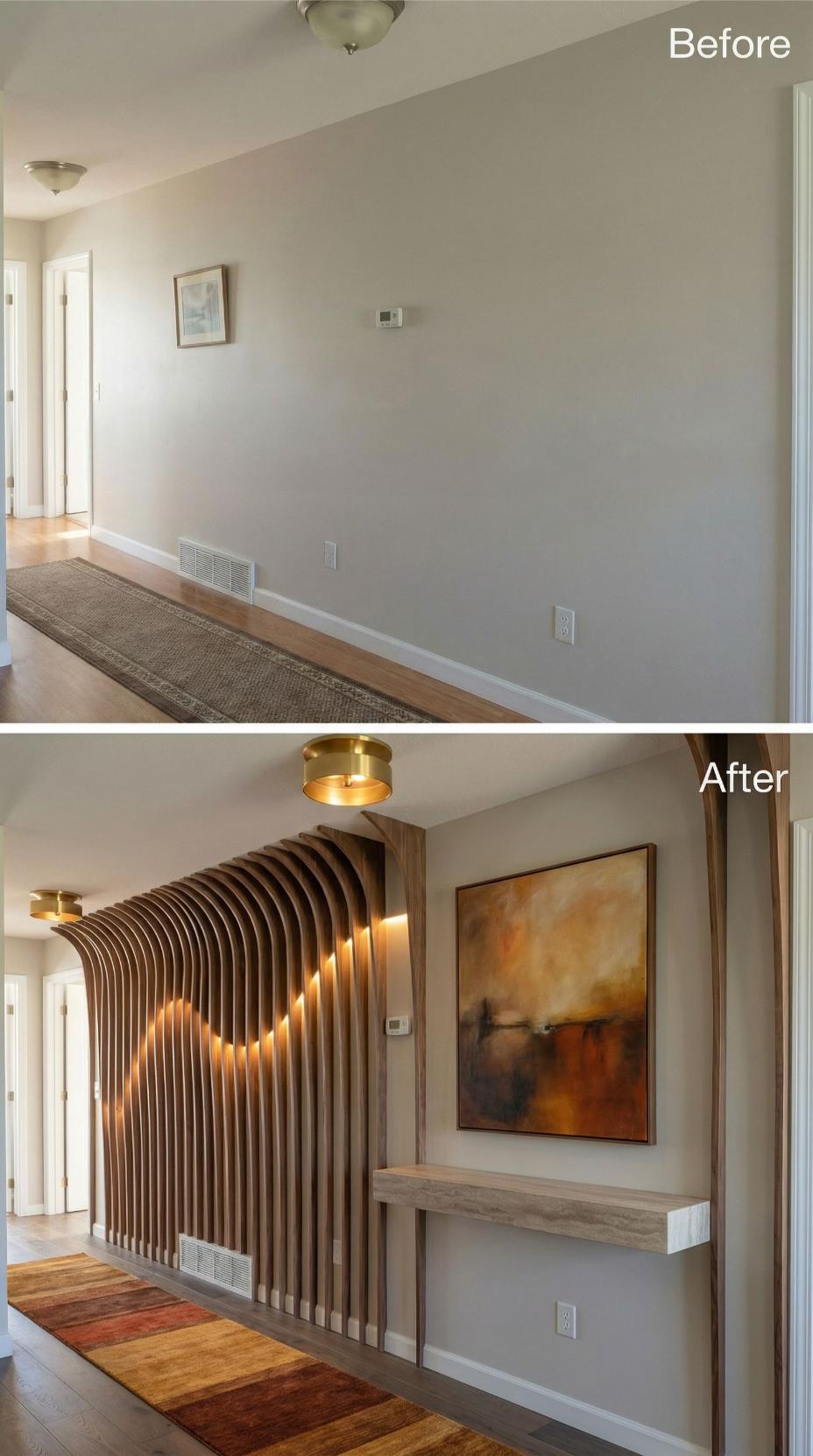 From Builder Grade Hallway to Sculptural Wood Feature Wall Showcase