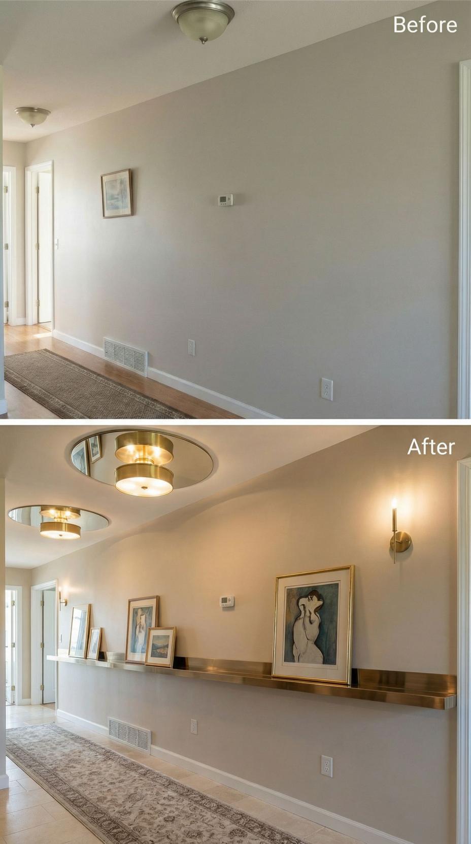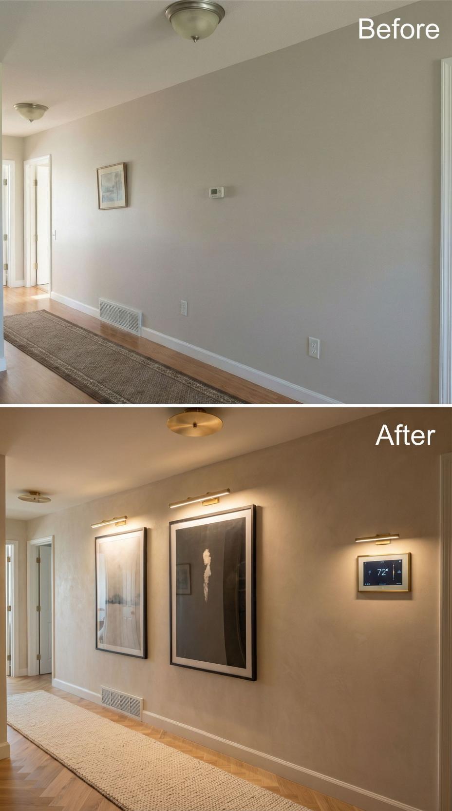 Strategic picture lighting transforms this builder grade hallway into an elevated art gallery experience. Two perfectly positioned pieces replace the single lonely frame, while sleek brass picture lights create dramatic focal points along the neutral wall. Modern flush mount ceiling fixtures and a contemporary thermostat upgrade complete the sophisticated transformation, proving that thoughtful lighting and curated artwork can turn any mundane corridor into an impressive design statement.