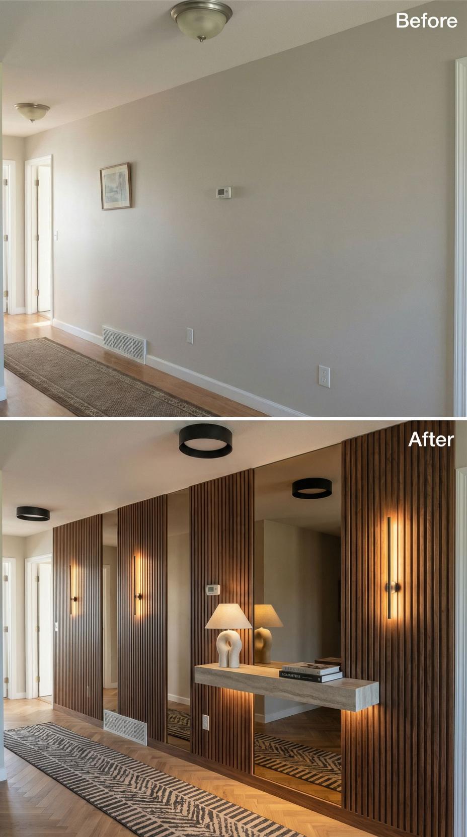 From Builder Grade Hallway to Warm Wood Slat Feature Wall Design