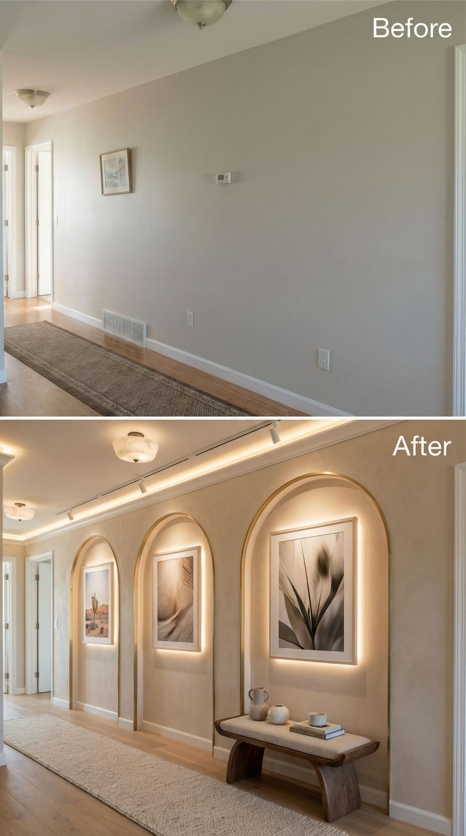 Architectural arched niches transform this once-bland corridor into an elegant art gallery. Integrated LED strip lighting illuminates framed botanical prints while creating dramatic shadows and depth. The contemporary wooden bench provides both function and visual weight, anchoring the space. Warm ambient lighting from the tray ceiling replaces harsh overhead fixtures, elevating the entire hallway experience.