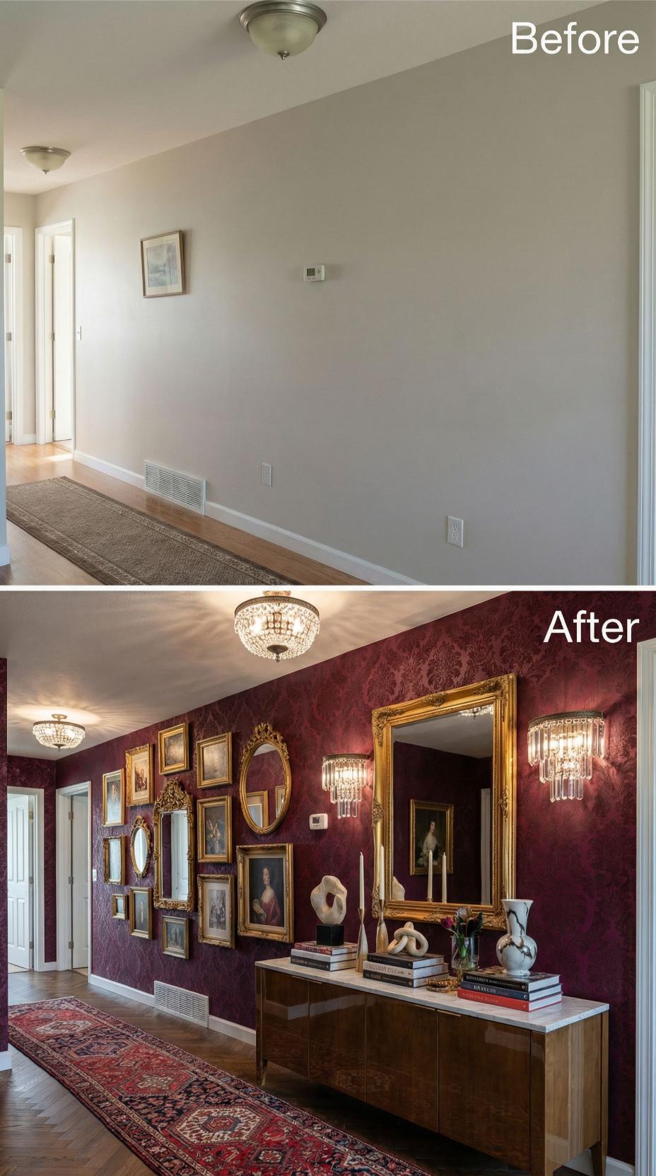 Rich burgundy damask wallpaper transforms this builder grade hallway into an elegant gallery space worthy of a luxury hotel. Gold-framed artwork creates a stunning salon wall arrangement, while crystal chandeliers and matching sconces replace basic ceiling fixtures. The mid-century walnut credenza grounds the dramatic transformation, providing both storage and display space for curated accessories.