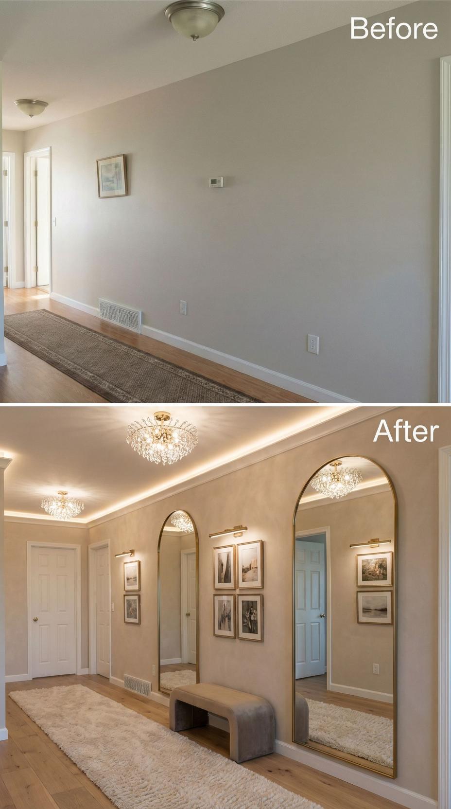 Crystal chandeliers and cove lighting transform this once-basic builder grade hallway into an elegant gallery space. Oversized arched mirrors create dramatic visual impact while reflecting light throughout the corridor. Picture ledges showcase curated artwork, and a plush velvet bench provides both seating and sophisticated style, completely reimagining the narrow passage.
