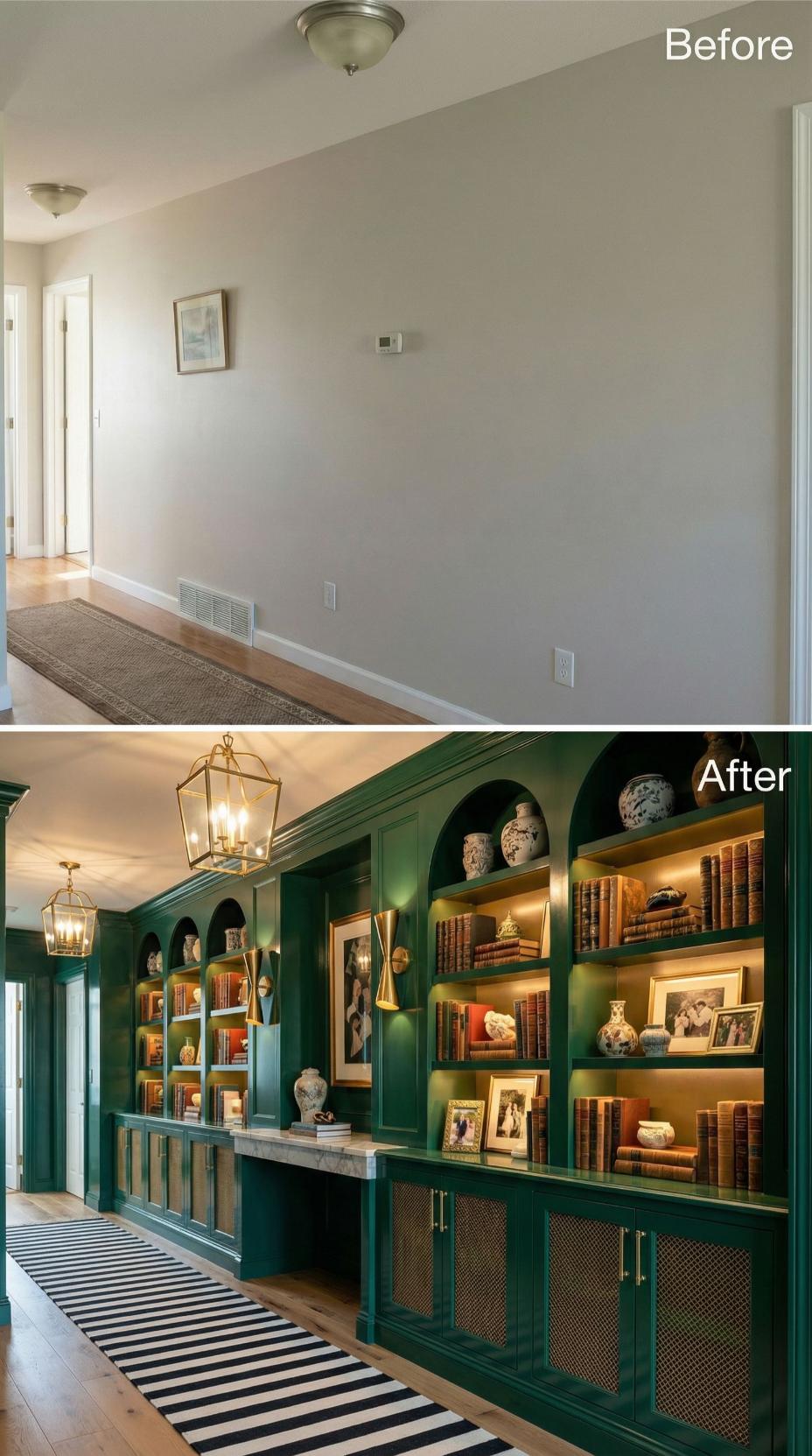 Rich emerald green built-in shelving transforms this once-bland builder grade hallway into a sophisticated library corridor. Warm brass lantern pendants illuminate leather-bound books and curated collectibles arranged on custom shelving with integrated LED strip lighting. Cane-front lower cabinets provide hidden storage while black and white striped runners add graphic contrast against the dark hardwood floors, creating an elegant passage worthy of a luxury home.