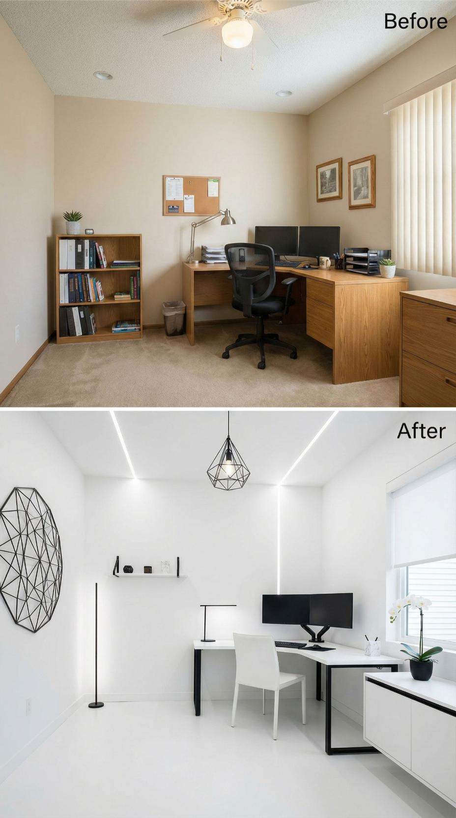 Warm wood furniture and beige carpet disappear in favor of crisp white surfaces and geometric black accents. The transformation eliminates visual clutter through streamlined built-ins, replaces the dated ceiling fan with sculptural pendant lighting, and introduces a striking monochromatic palette. Clean lines and strategic negative space create an executive-worthy workspace that commands attention and respect.