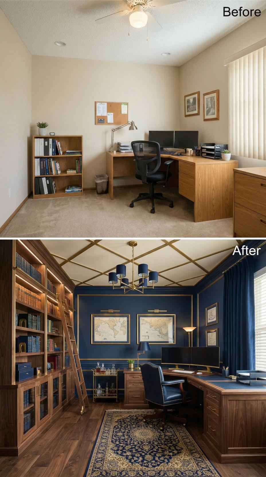 Rich navy walls and coffered ceiling details transform this ordinary builder grade home office into a sophisticated power space. Floor-to-ceiling built-in bookcases with rolling ladder create impressive storage while gold-framed maps and brass chandelier establish executive authority. The L-shaped walnut desk anchors the roomโs corner layout, while Persian rugs and navy curtains add luxurious warmth to hardwood floors.