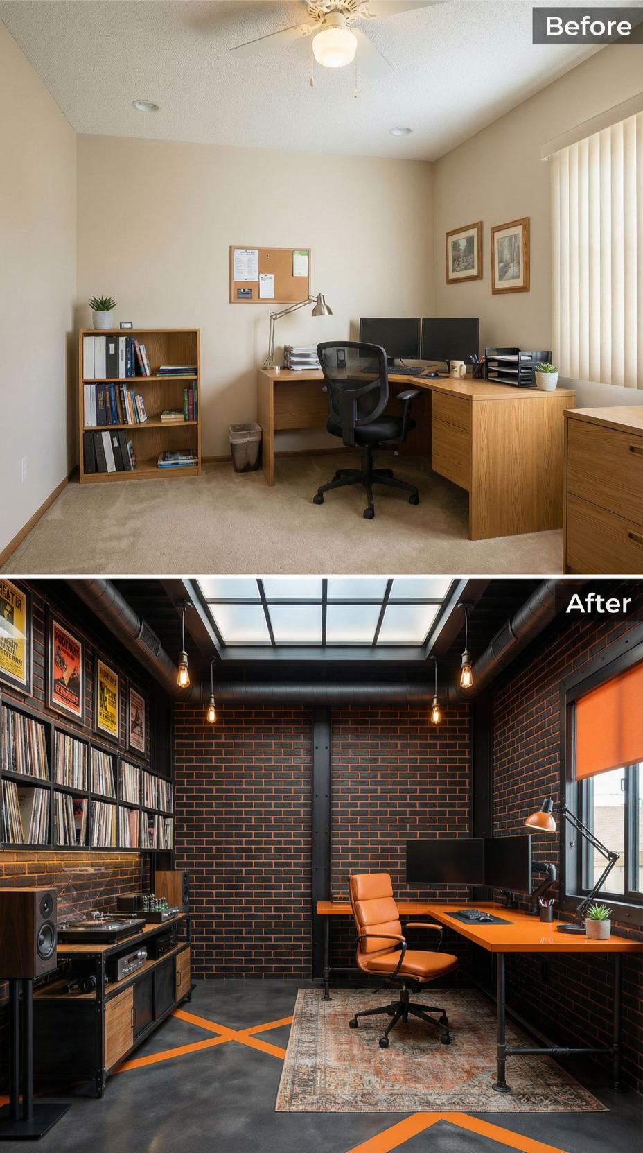 Exposed brick walls and Edison bulb pendants transform this once-bland builder grade home office into a sophisticated industrial sanctuary. The dramatic makeover replaces beige walls and basic furniture with rich textures, strategic orange accents, and vinyl record storage that doubles as wall art. A sleek orange leather chair commands attention at the custom desk, while geometric floor patterns and vintage posters create the perfect backdrop for serious productivity.
