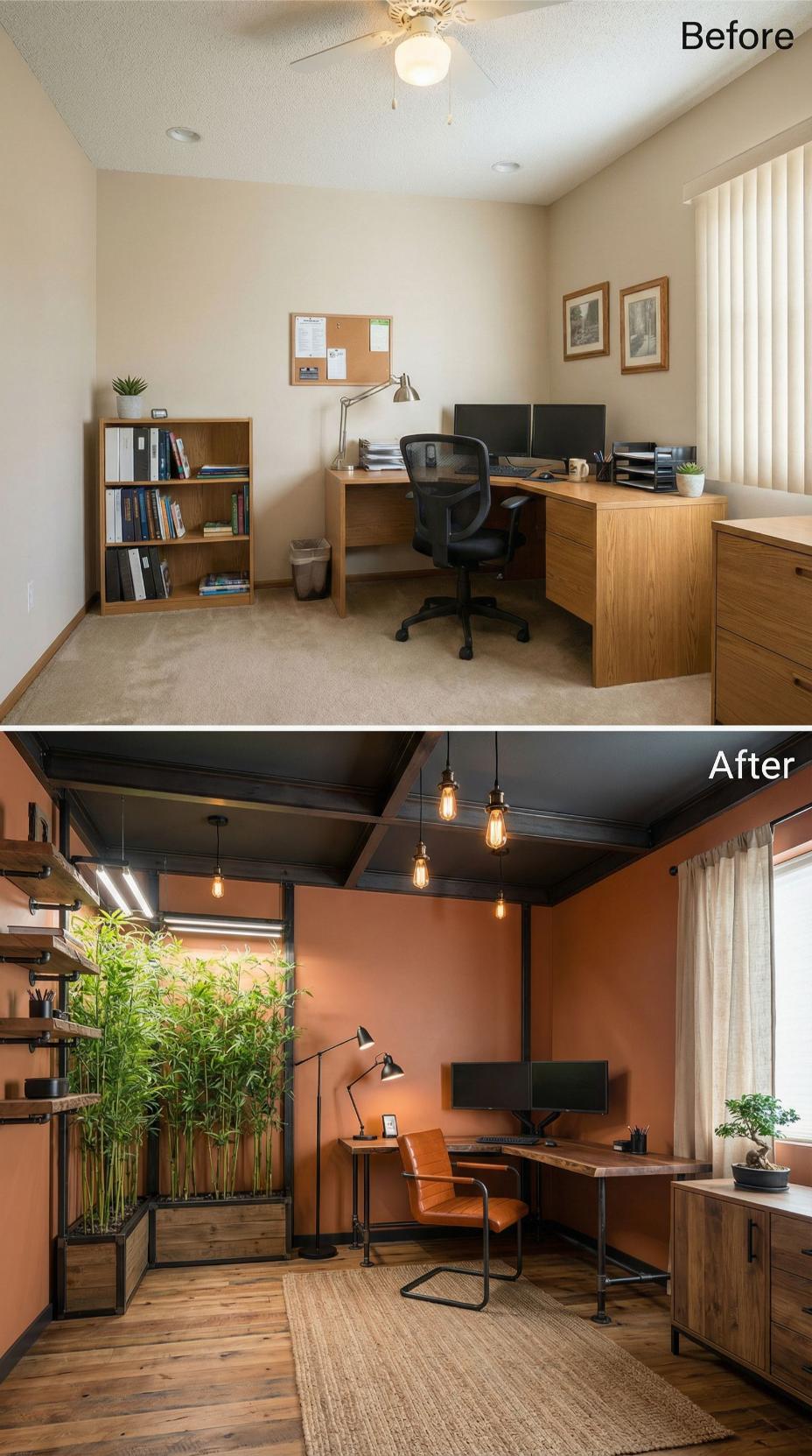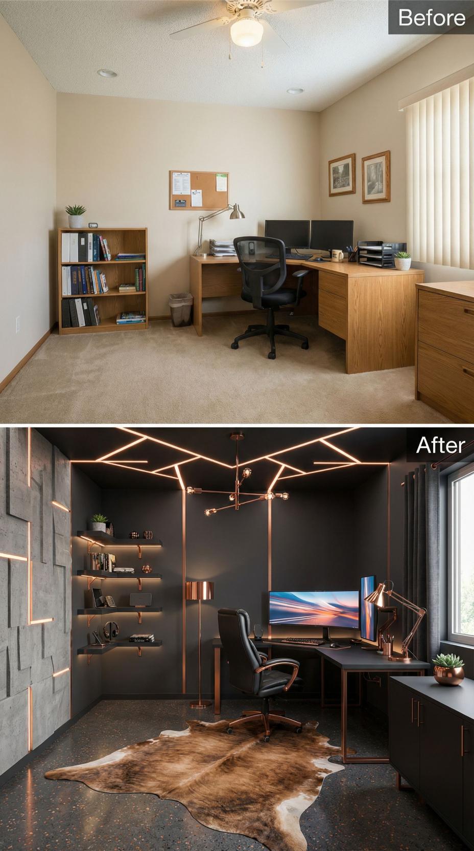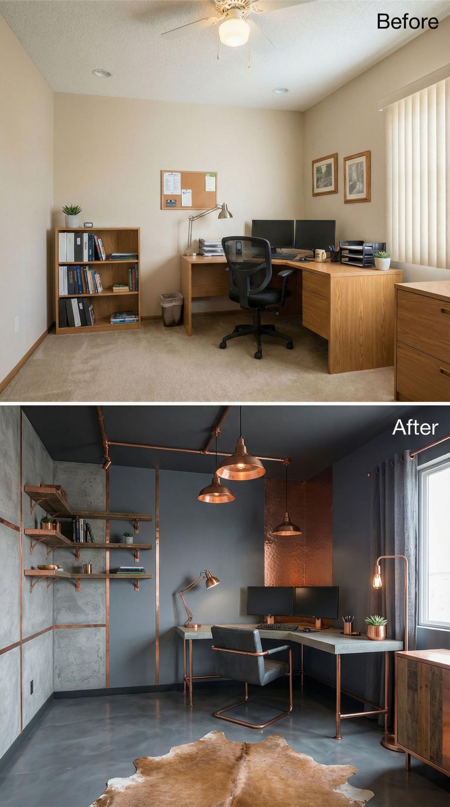 Dramatic dark walls and copper accents completely revolutionize this once-generic workspace. The transformation replaces bland beige walls and standard wood furniture with sophisticated charcoal paint, industrial copper piping shelving, and statement pendant lighting. Concrete floors and a cowhide rug add textural interest, while the custom copper-framed desk creates a striking focal point that commands attention in this newly reimagined professional sanctuary.