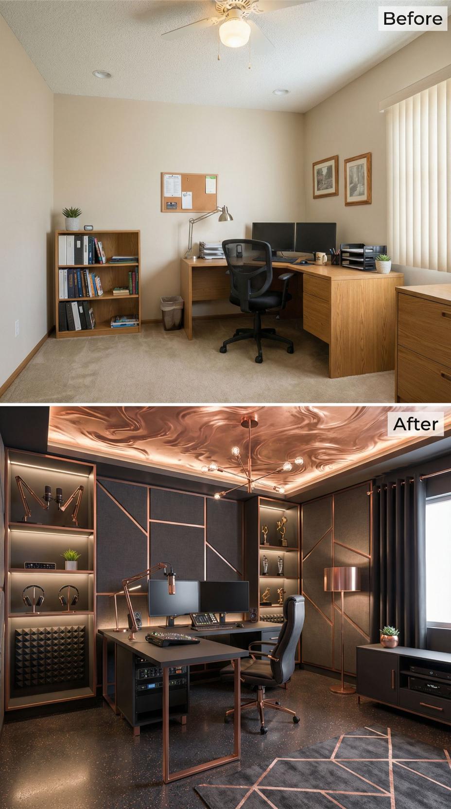 Dramatic copper ceiling treatments and geometric wall paneling transform this mundane builder grade home office into a commanding executive workspace. Rich charcoal walls adorned with metallic linear details replace bland beige surfaces, while integrated shelving showcases trophies and awards with purposeful lighting. The sleek copper desk lamp and matching accents create a cohesive luxury aesthetic that demands attention and respect.