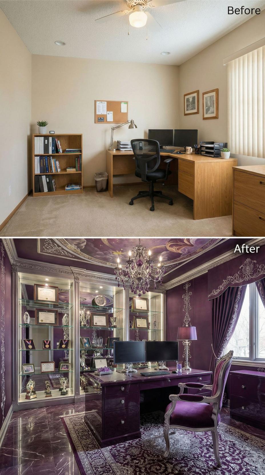 Rich burgundy walls and ornate crown molding transform this mundane builder grade home office into a palatial executive retreat. Crystal chandeliers replace basic ceiling fans while glass display cabinets showcase achievements and awards. Luxurious marble flooring, heavy velvet drapery, and an imposing dark wood desk create an atmosphere of authority and success that commands respect from every visitor.