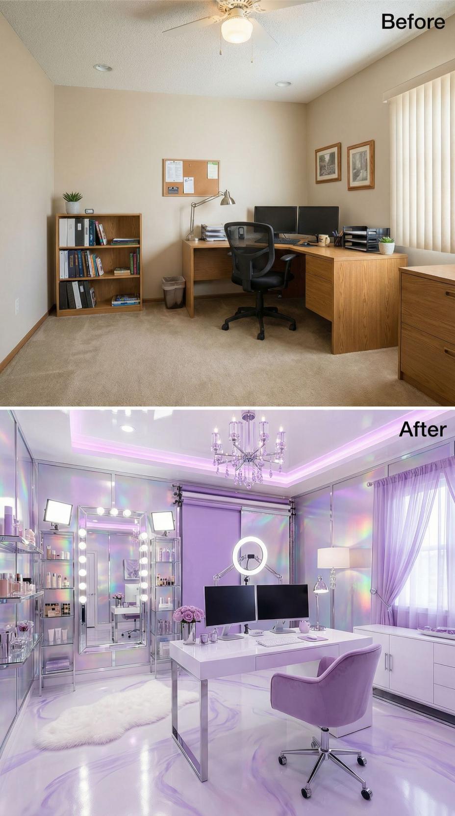 Purple iridescent wallpaper transforms this mundane builder grade home office into a glamorous content creation studio. The upgraded space features a crystal chandelier, Hollywood-style vanity mirror with bulb lighting, and sleek white furniture that screams luxury. Purple LED accent lighting and matching curtains create an Instagram-worthy backdrop, while built-in storage keeps beauty supplies organized for the ultimate influencer headquarters.