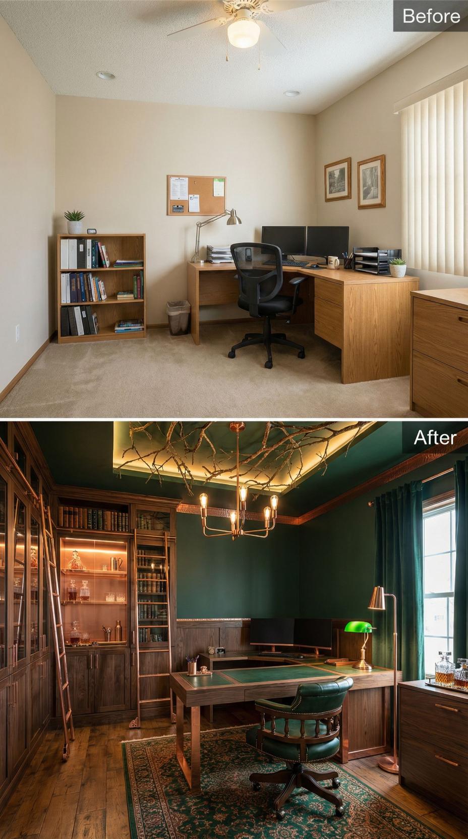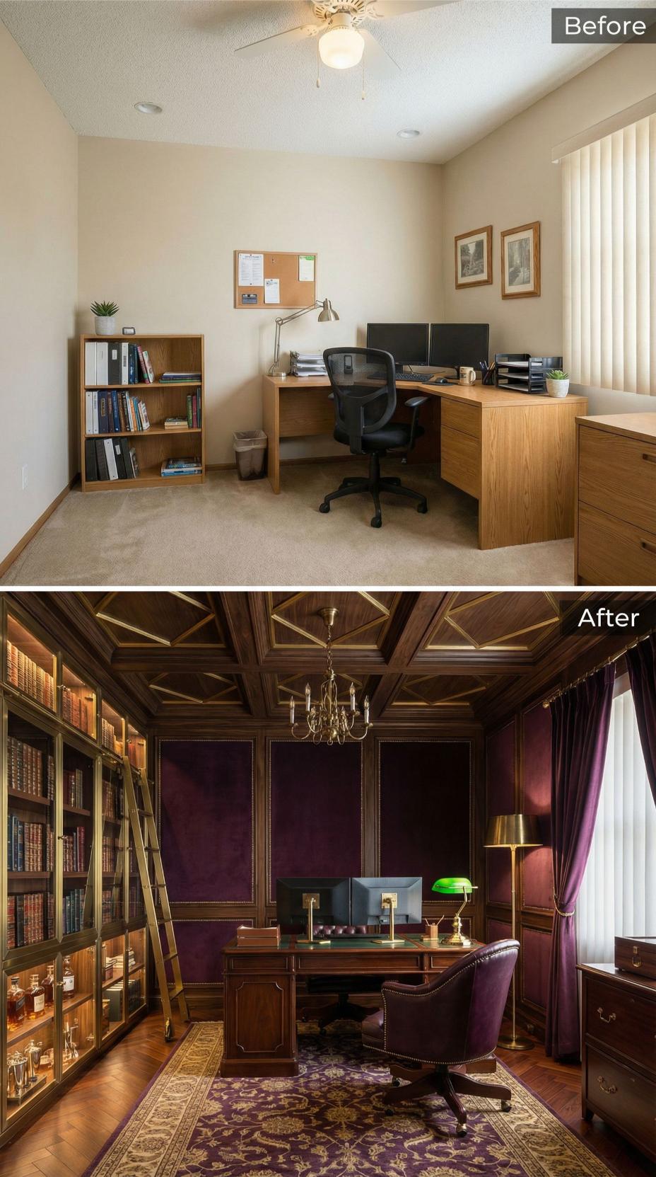 Emerald peacock wallpaper and coffered ceilings transform this mundane builder grade home office into a luxurious power sanctuary. Rich mahogany built-ins with rolling ladder replace simple wooden shelving, while crystal chandeliers and tufted leather seating create an atmosphere of refined authority. Ornate gold-detailed desk and plush velvet curtains complete the dramatic metamorphosis from ordinary workspace to executive retreat.