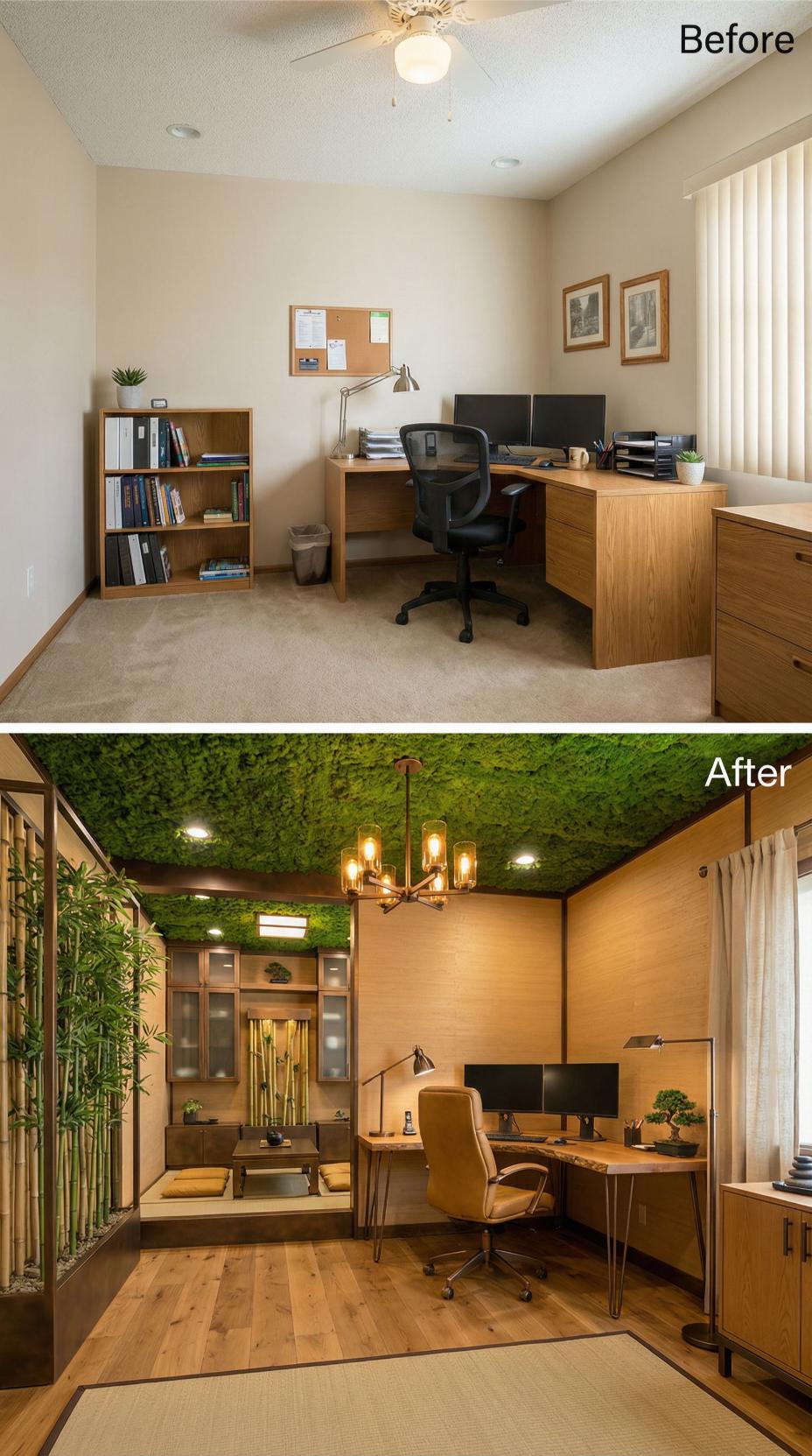 Moss-covered ceilings and integrated bamboo planters transform this mundane builder grade home office into a nature-inspired executive retreat. Rich wood paneling replaces bland beige walls while sophisticated pendant lighting upgrades the basic ceiling fan. A sunken seating area with built-in storage creates distinct zones for work and relaxation, perfectly suited for those who demand impressive spaces that reflect their elevated status.