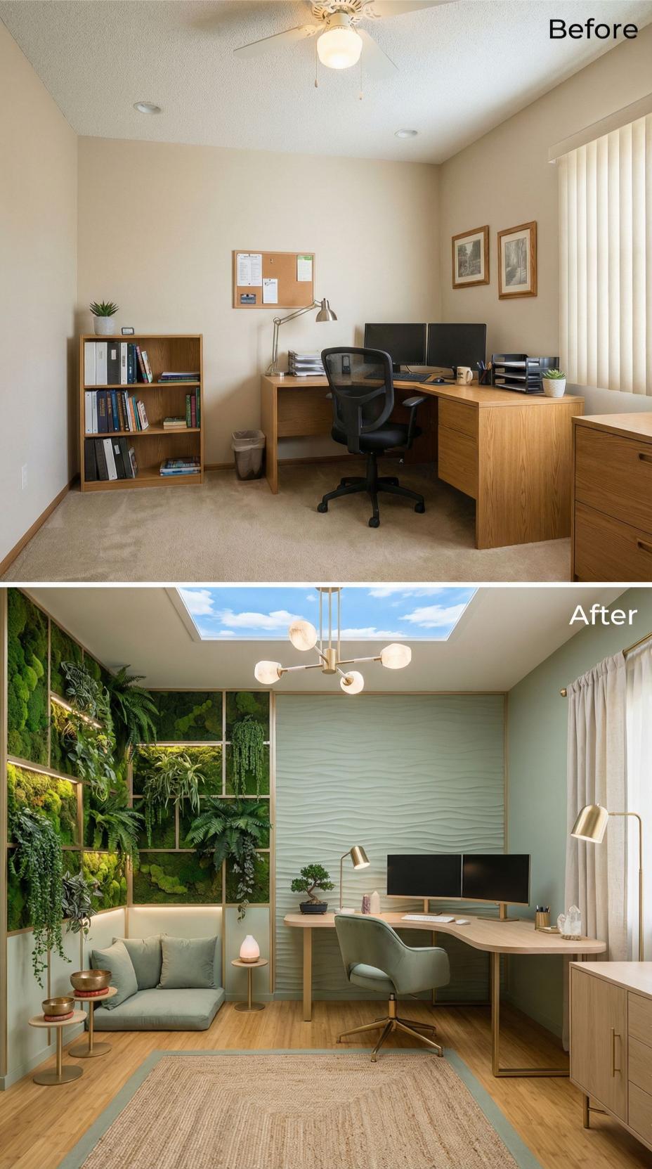 Natural textures and living greenery transform this builder grade home office into a wellness-focused workspace worthy of executive admiration. The stunning vertical garden wall creates an impressive backdrop, while sage green upholstery and warm wood tones replace the dated beige palette. A sleek skylight introduces natural illumination above the curved desk setup, complemented by sophisticated brass pendant lighting that elevates the entire aesthetic.