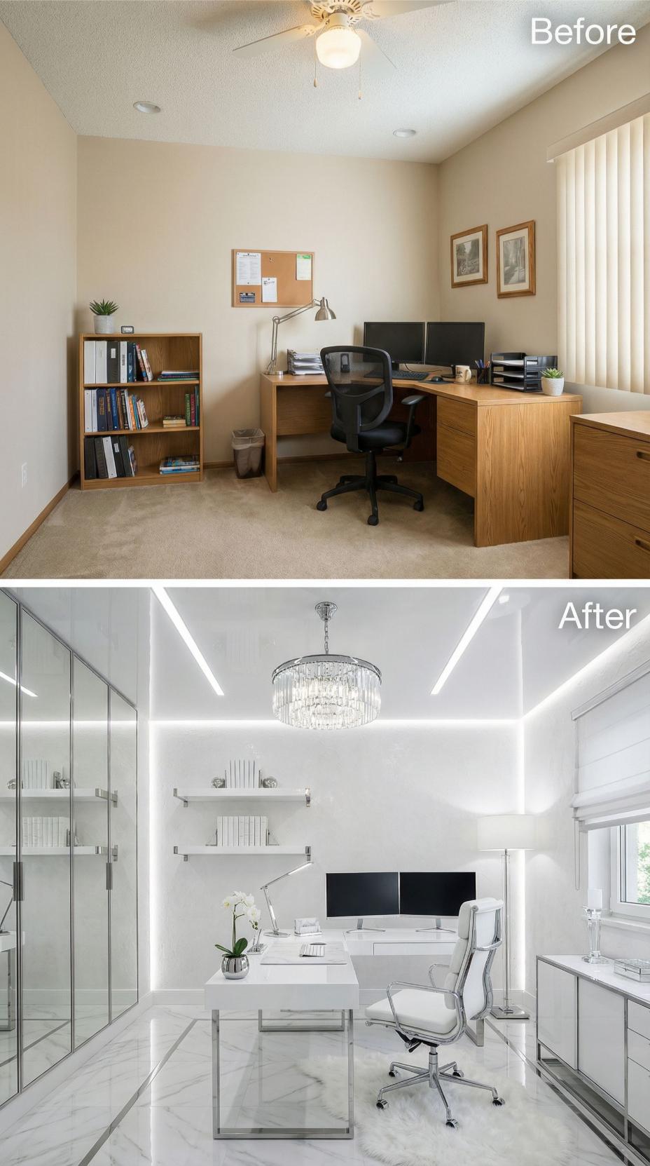 Gleaming marble surfaces and a stunning crystal chandelier transform this ordinary builder grade home office into an executive powerhouse. White lacquer storage cabinets replace humble wood bookcases, while LED strip lighting creates dramatic ceiling architecture. The sleek glass desk and transparent chair establish a sophisticated floating effect, perfectly complemented by floating shelves that showcase curated accessories with museum-like precision.