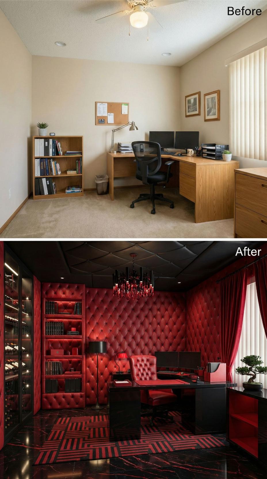Bold red tufted leather transforms this mundane builder grade home office into a commanding executive sanctuary. Rich burgundy walls, dramatic black coffered ceilings, and plush velvet curtains replace the bland beige palette and basic furnishings. Crystal chandeliers and built-in wine storage elevate the space from functional workspace to an indulgent retreat designed for those who demand attention and luxury in every detail.