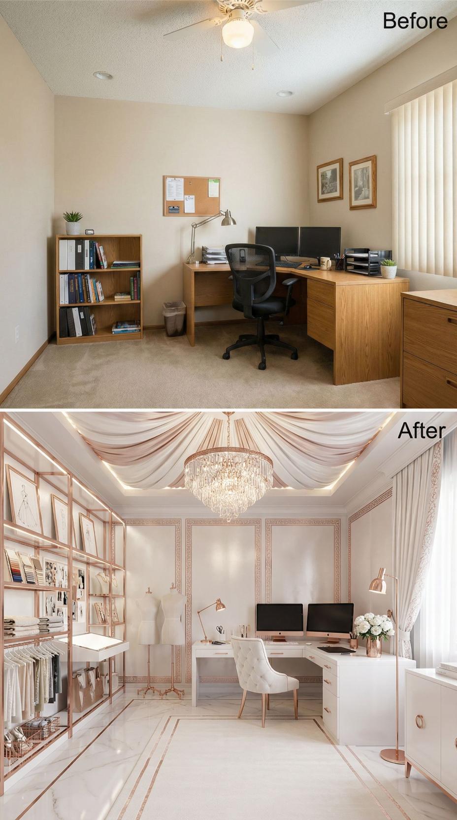 Rose gold accents and crystal chandeliers transform this mundane builder grade home office into a glamorous workspace worthy of social media fame. Sleek white lacquer surfaces replace basic wood furniture, while dramatic draped ceilings and ornate molding create an opulent atmosphere. The sophisticated color palette elevates every detail, from copper task lighting to perfectly styled shelving displays.