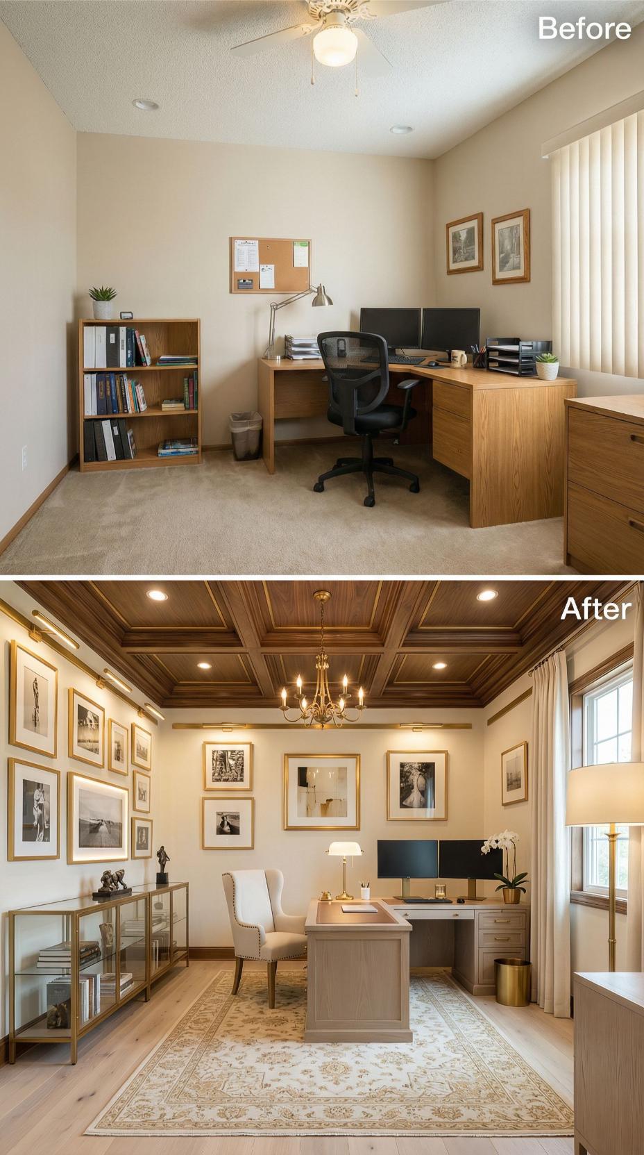Coffered ceilings and rich wood paneling transform this mundane builder grade home office into a commanding executive retreat. The original basic desk setup gives way to sophisticated built-ins, gallery walls showcasing impressive artwork, and luxurious furnishings that project authority. Premium lighting, including a statement chandelier and strategic recessed fixtures, creates dramatic ambiance while gold accents and plush seating establish an atmosphere of refined success and professional prestige.