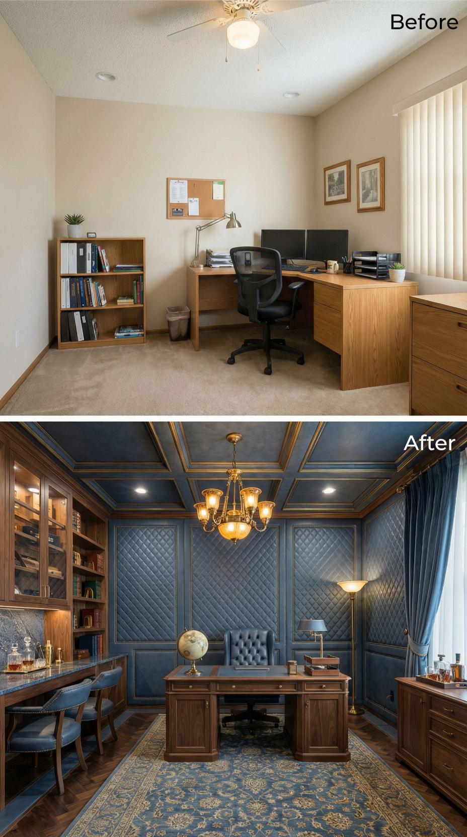 Deep navy quilted wall panels transform this builder grade home office into a commanding executive retreat. Rich wood built-ins replace simple shelving while an ornate coffered ceiling elevates the space dramatically. The stunning chandelier anchors luxurious navy drapery and a plush patterned rug. Traditional brass hardware and leather seating complete this sophisticated transformation from bland carpeted workspace to impressive personal library.